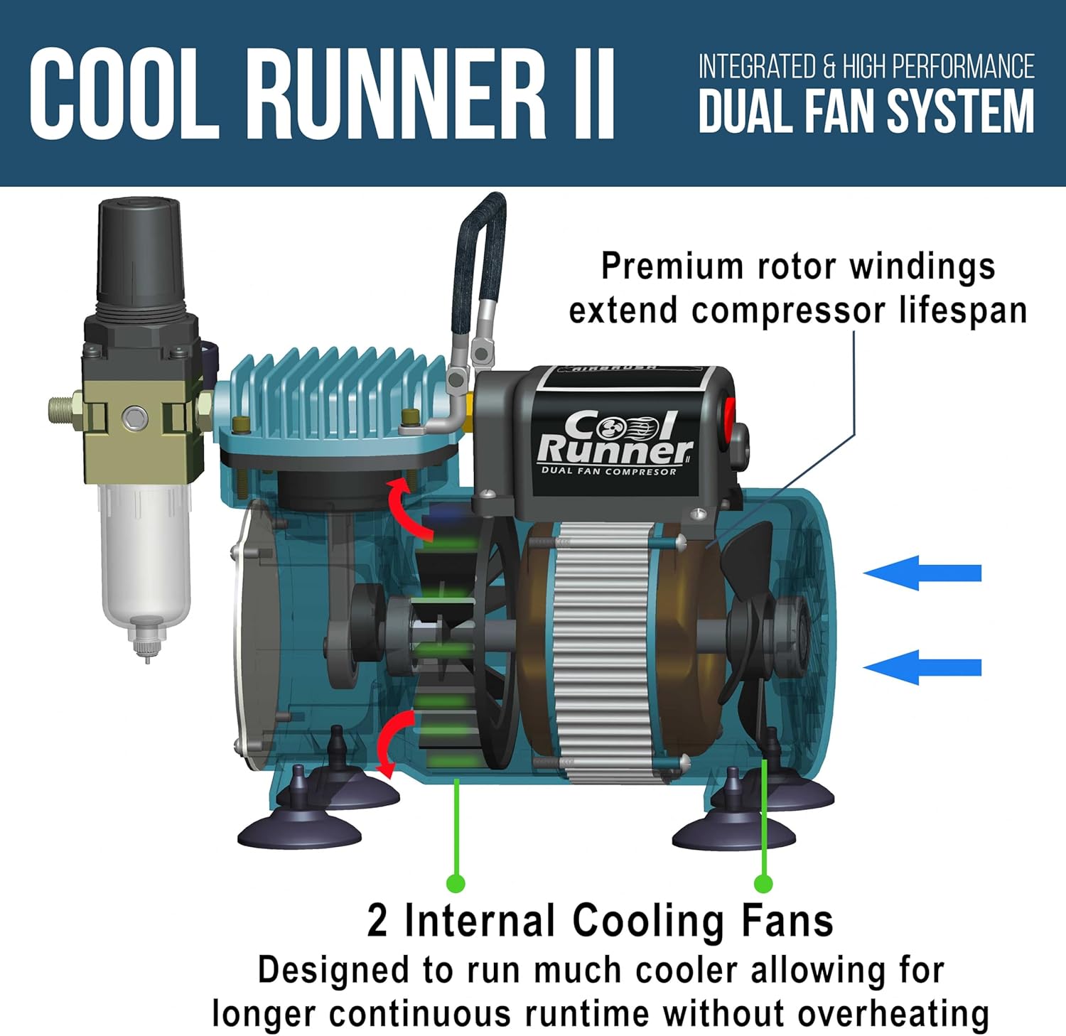 Model TC-320 Cool Runner II superior performance powerful 1/5 hp single-piston compressor with two cooling fans that allow it to run much cooler for a longer continuous running time without overheating. Includes airbrush holder for 2 airbrushes.