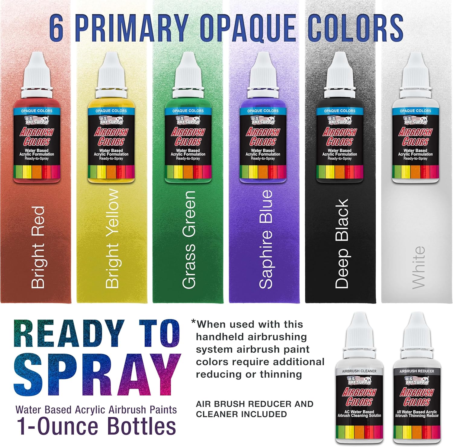 U.S. Art Supply Primary Colors Water-Based Acrylic Airbrush Paint Kit (6 Colors in 1 oz. Bottles plus Reducer and Cleaner). 6 Opaque colors included: bright sapphire blue grass green bright yellow bright red deep black and white. Bonus double sided color mixing wheel and cleaning brush set.