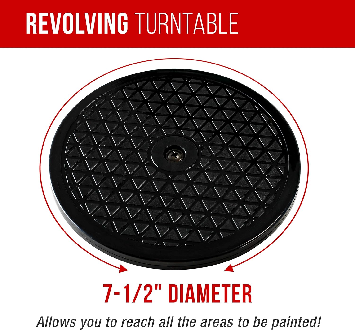 Work Area & Turntable: Each provide a 22.25 x 19 x 14 inch work area with LED lighted work area. Includes a 7.5 inch diameter revolving turntable. Combine spray booths to create a larger work area.