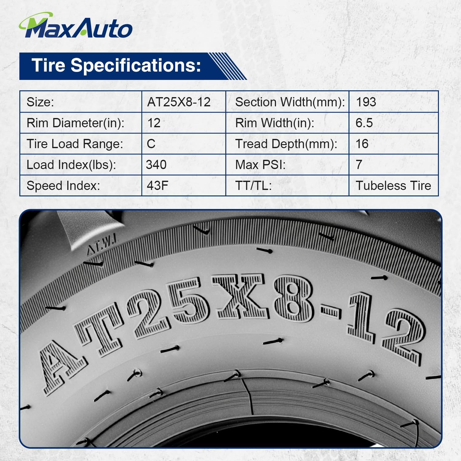 Rear Tire Parameters: Size:25x10-12 tread depth:0.63"; rim width:8; tubeless; max load; 420lbs; load/speed index:50F; psi:7 (Please check the original tire size before purchasing)