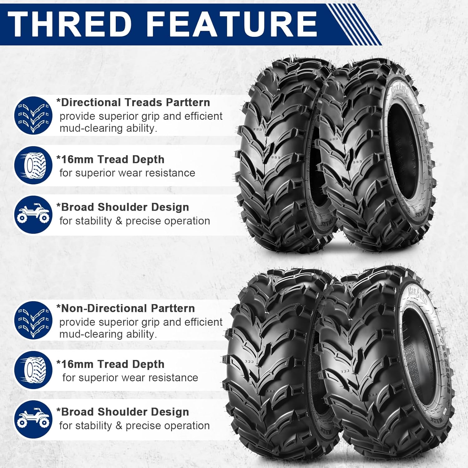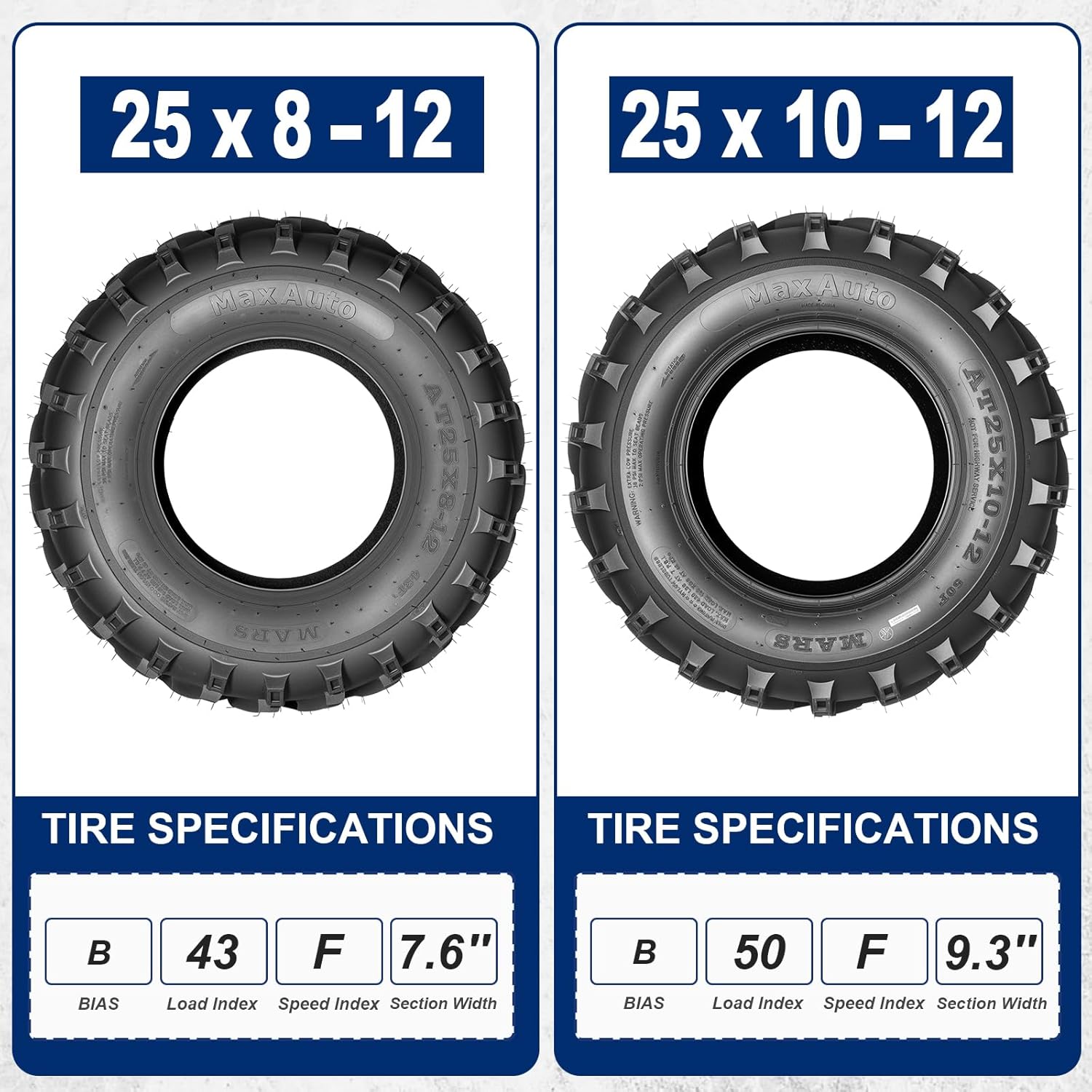 Package Include2pcs 25x8-12 Front & 2pcs 25x10-12 Rear ATV tires (Tires only ). Kindly reminderIn this case purchasing a quantity of 1 means you will receive a pair of 25-8-12 atv tires and a pair of 25-10-12 atv tires