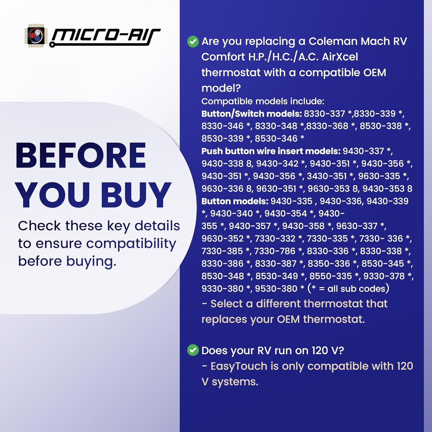 CHOOSE THE RIGHT FIT FOR YOUR THERMOSTAT: Refer to our model guide in the images to find the correct replacement for your thermostat for RVs. The 352 Black and White model are specifically designed to replace the COLEMAN MACH 12V RV COMFORT H.P H.C A.C - AIRXCEL Thermostats (Button/switch 8330*337* 8330*339* 8330*346* 8330*348* 8330*368* 8530*338* 8530*339* 8530*346* 3) (Push button wire insert models 9430*337* 9430*338* 9430*342* 9430*351* 9430*356* 3430*351* 9630*335* 9630*336* 9630*351* 9630*353* 9430*353*). These programmable thermostats are designed for both cooling and heating with a simple installation process.