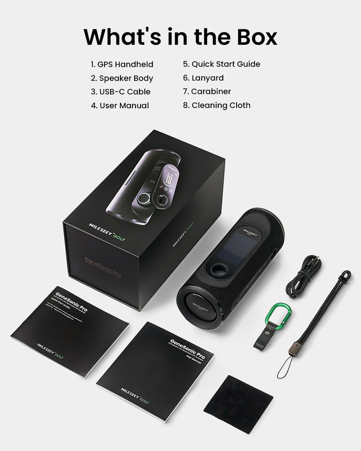 What's in the Box - GeneSonicpro Golf Speaker comes with extensive accessories kit: Speaker Lanyard 1 Handheld Carabiner1 Cleaning Cloth 1 USB-C Charging Cable 1 Quick Guide 1 User Manual 1.