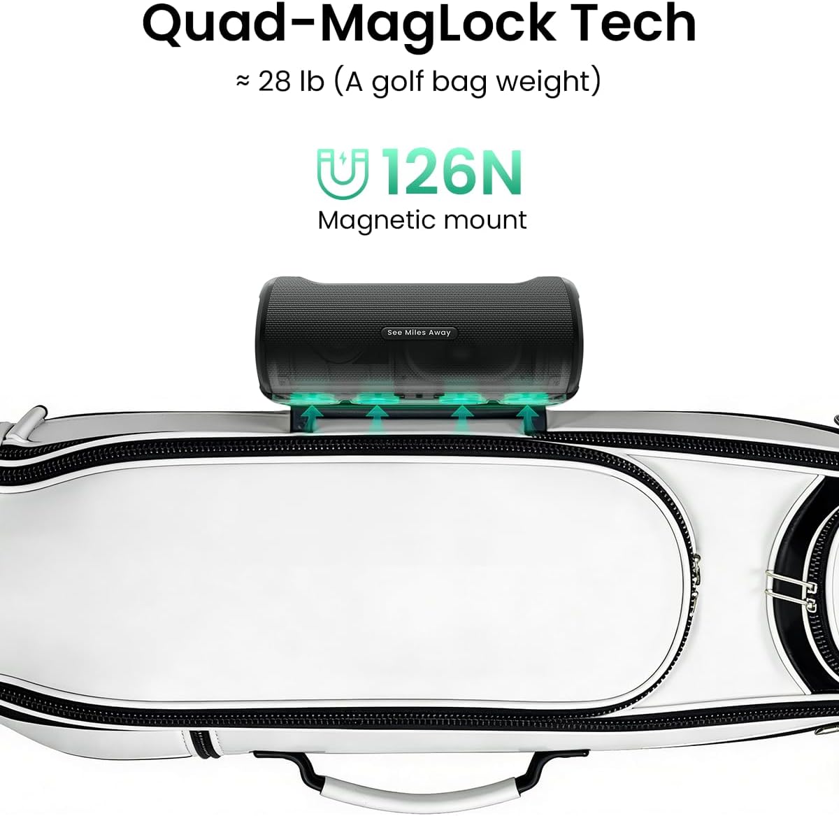 Quad-MagLock Technology - With four powerful integrated magnets delivering 126N of force (equivalent to 28 lbs of magnetic strength) this golf GPS speaker affixes securely to your golf cart or any metal surface even on bumpy or hilly courses. The recessed screen and reinforced corner design provide protection for this golf cart speaker against impacts.