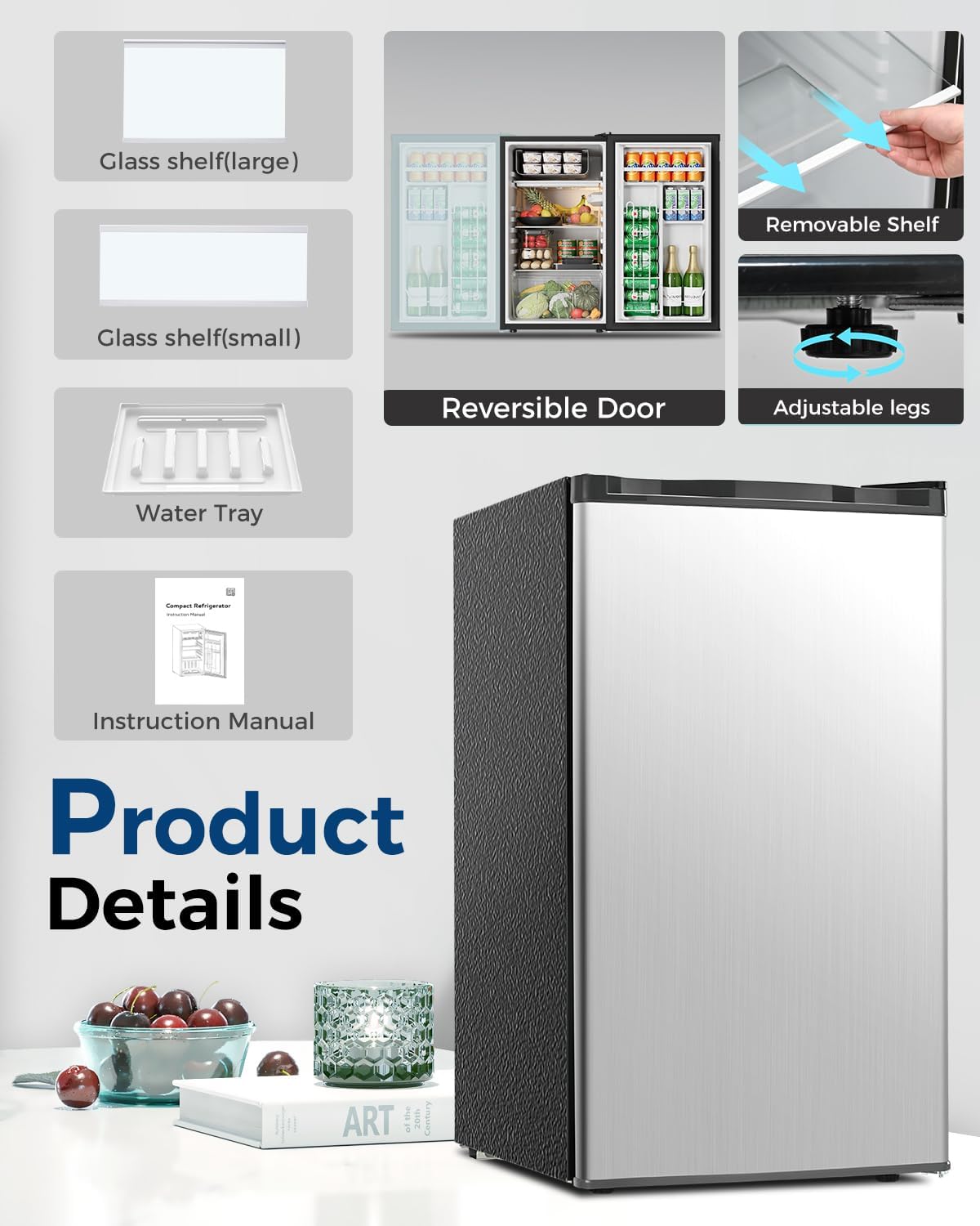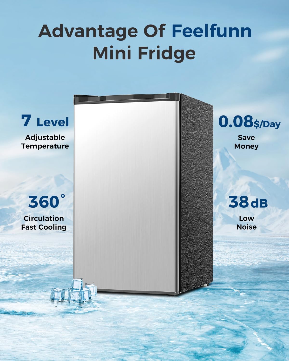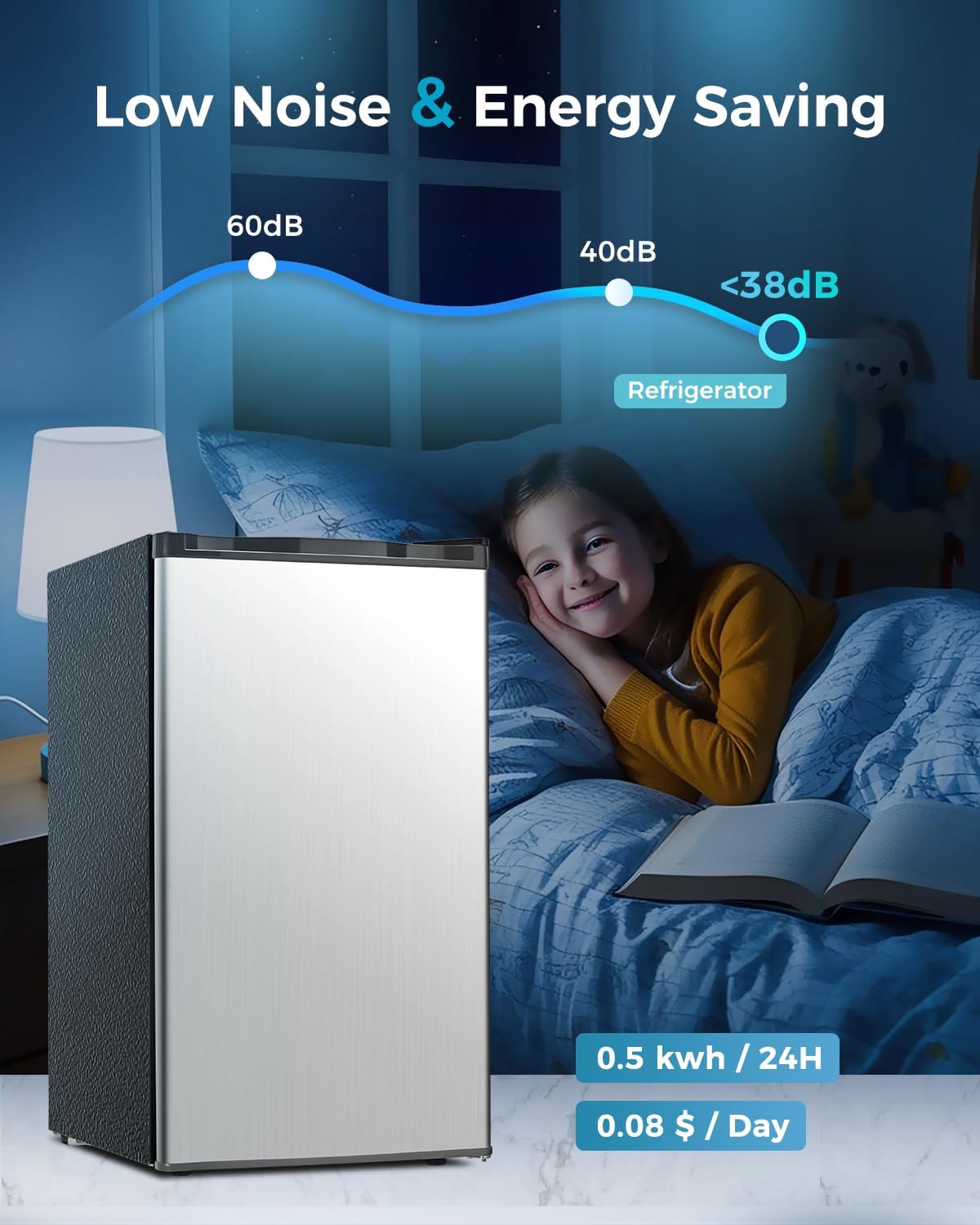 Low Noise & Energy-Efficient - Operating quietly at 38 dB our bedroom mini fridge maintains a peaceful atmosphere for study relaxation or work environments. With energy costs as low as 0.5 kWh (about $0.08 daily) enjoy tranquil lifestyles in dorms kitchens game rooms offices and study areas saving on bills while eliminating disruptive sounds!