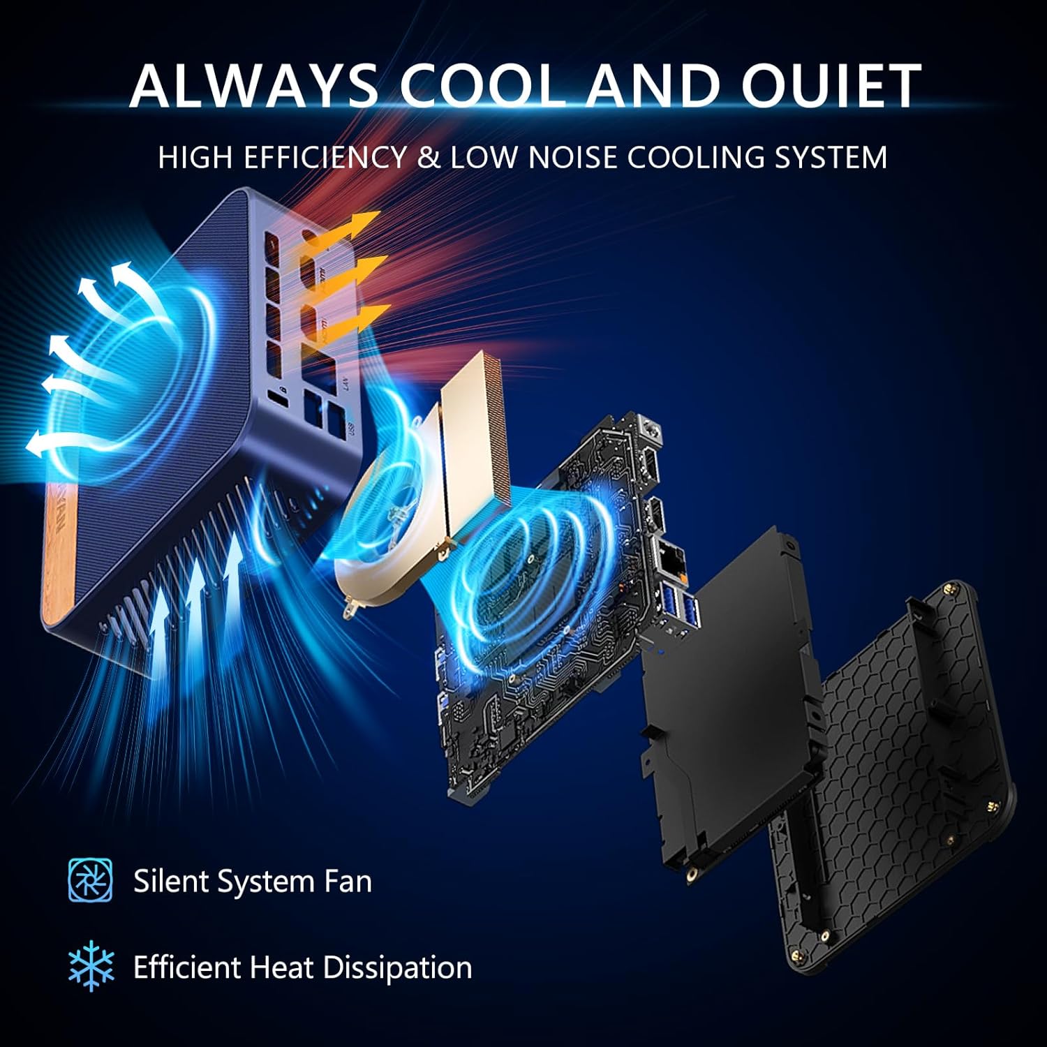 Quiet Cooling System & Versatile InterfacesThe micro computer features an ultra-quiet fan and efficient heat sink that work together to keep the CPU processor cool ensuring quicker response times and preventing overheating during multitasking. The computer mini desktop offers multiple interfaces including 4 *USB 3.2 Gen 2 ports (up to 10 Gbps transfer speeds) 2*HDMI 2.0 ports 1*Gigabit Ethernet port 1*audio jack and 1*DC jack providing versatile connectivity options for all your needs
