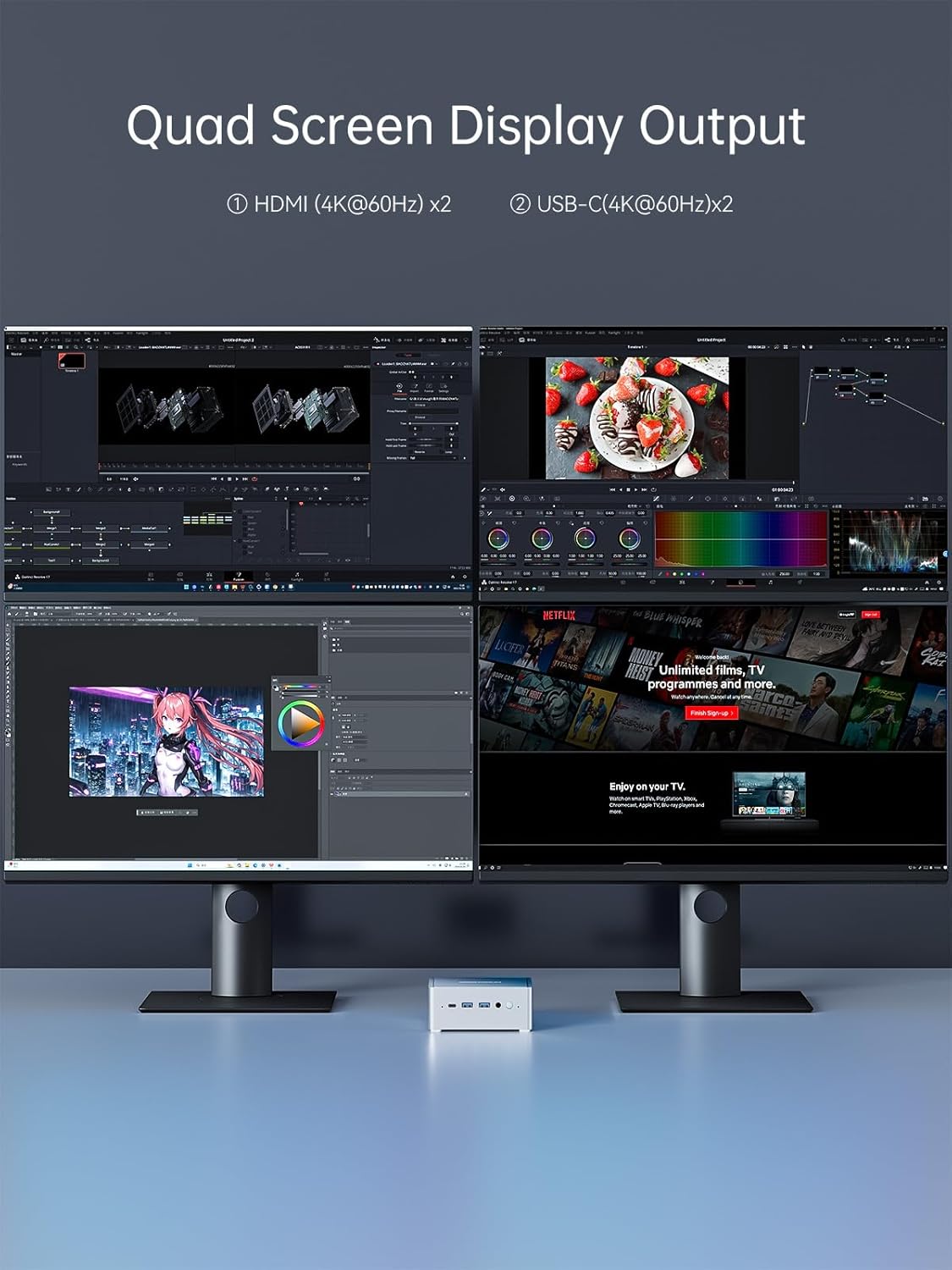 4K Quad Display OutputsThe Mini PC comes with a 4K@60Hz ultra-high-definition Intel UHD Graphics to enjoy a high-quality visual experience. 2* HDMI ports and 2*USB-C support 4K four-screen output and can connect four monitors at the same time which can provide incredible clarity and maximum work efficiency.