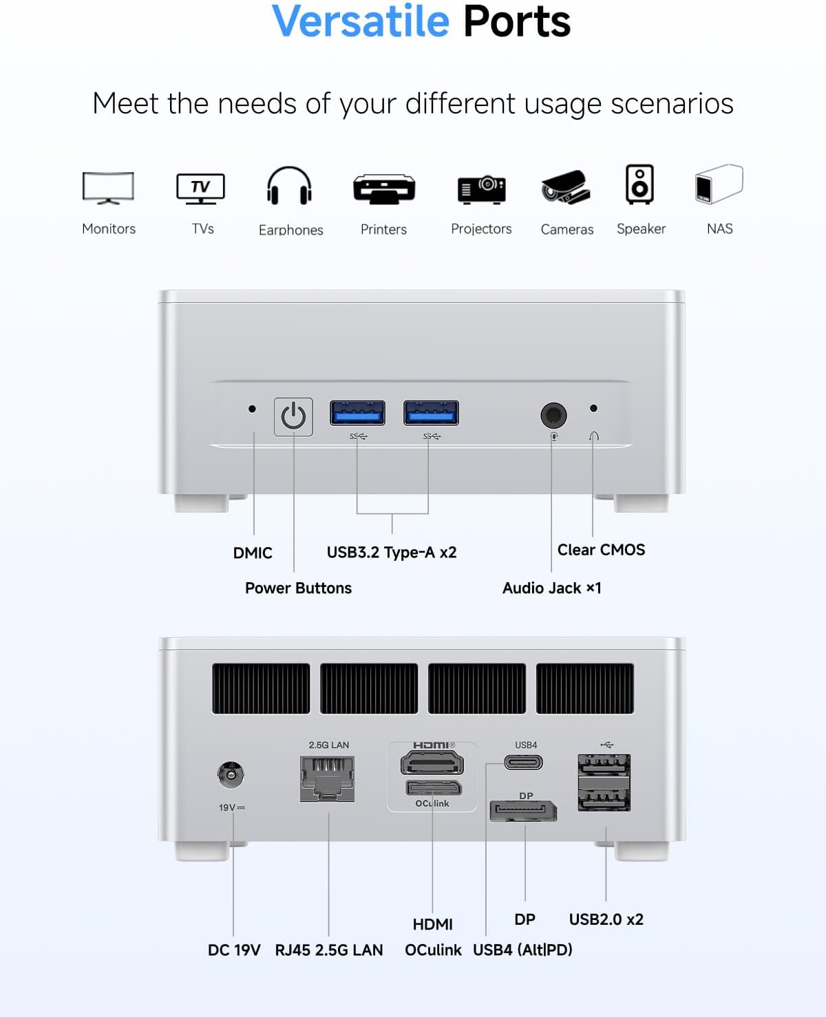 Triple Display OutputThis Mini Computers is equipped with HDMI2.1(8K@60Hz | 4K@120Hz) USB4(8K@60Hz | 4K@120Hz) and DisplayPort1.4(4K@120Hz) display outputs you can connect three independent displays at the same time to meet the demands of daily multitasking. Increase your productivity by expanding multiple workspaces.