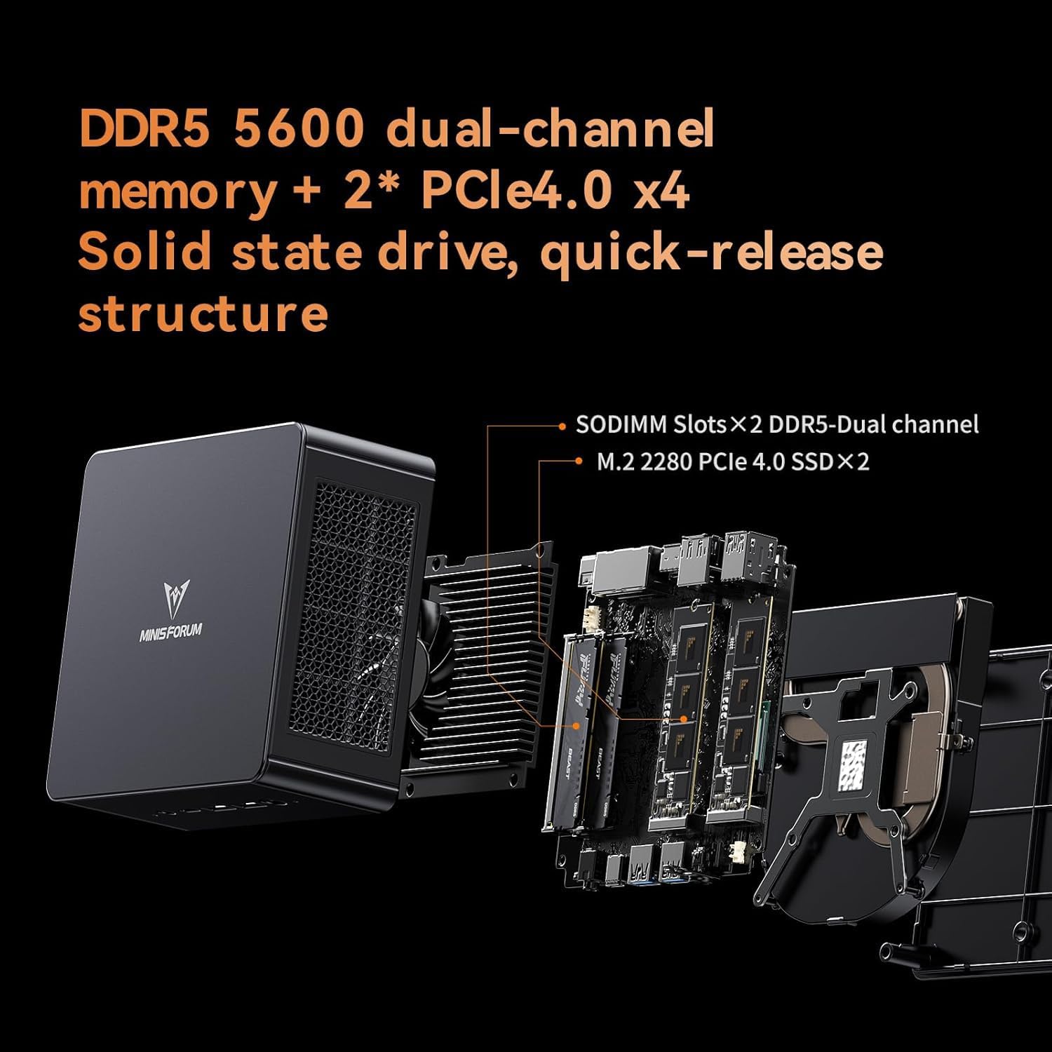 Large Memory & Storage SupportUM890 Pro supports dual-channel DDR5 32GB RAM(2x16GB) is equipped with a SODIMM slot frequency of up to 5600 MHz and can be expanded up to 96 GB. In terms of storage it provides two M.2 2280 PCIe4.0 SSD slots supports rapid removal and can be expanded up to 8 TB facilitating rapid upgrading and replacement.