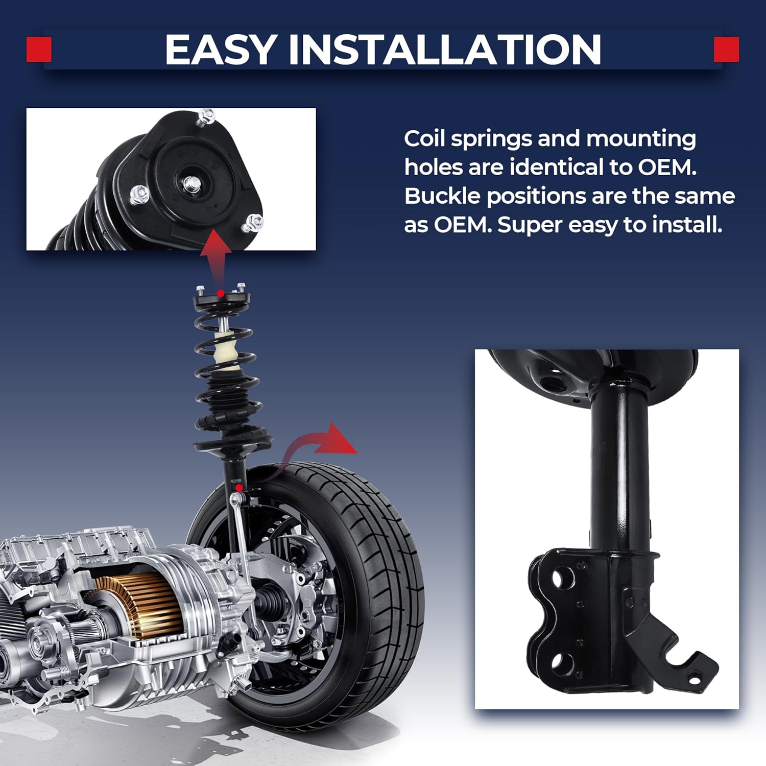 [Precise fit]:All Shock and Strut Assemblies are Engineered to match your specific make and models OE specificationsno gaps no modifications required. Pre-drilled holes line up perfectly with factory mounting points ensuring a seamless fit that preserves your vehicles original performance and structural integrity.