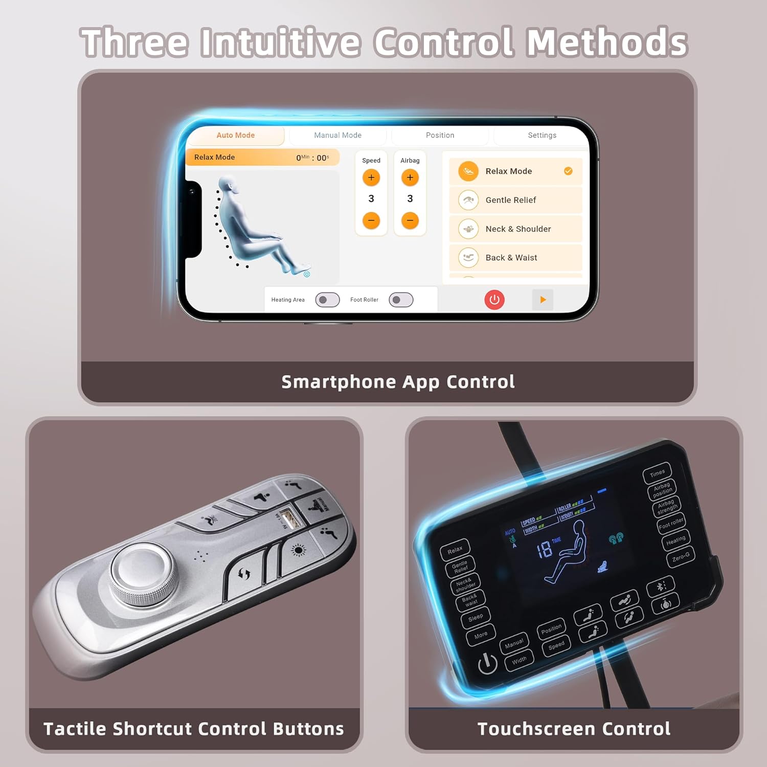12 Auto Programs & Manual Options Choose from Relax Gentle Neck & Shoulder Spine Care Full Airbag Deep Tissue Energy Sleep Office Senior Waist & Hip and Vitality modes or customize manually with multiple techniques speeds widths and intensities to match your personal preferences.