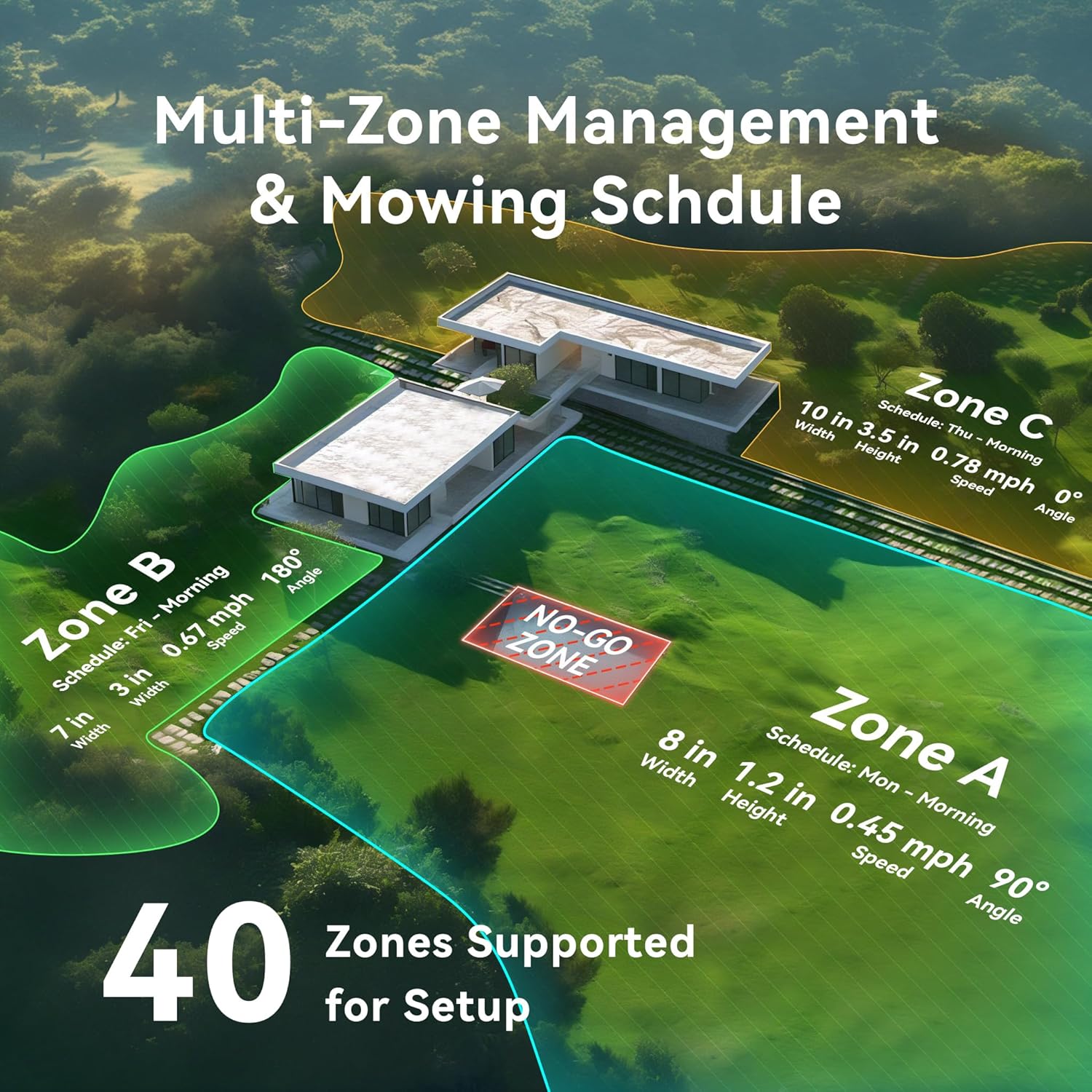 0.75 Acre. Yes. Just One Mower: Thanks to powerful vision and spatial fusion technology the mower can "understand" its surroundings like human eyes. It supports edge mapping of up to 0.75 acre (32 670 sq.ft / 3000) and ensures consistently centimeter-accurate positioning. Users can customize 40 working areas via the app and define no-go zones such as pools flower beds and play areas all of which are accurately recognized. Daily lawn care becomes effortless with the schedule function.