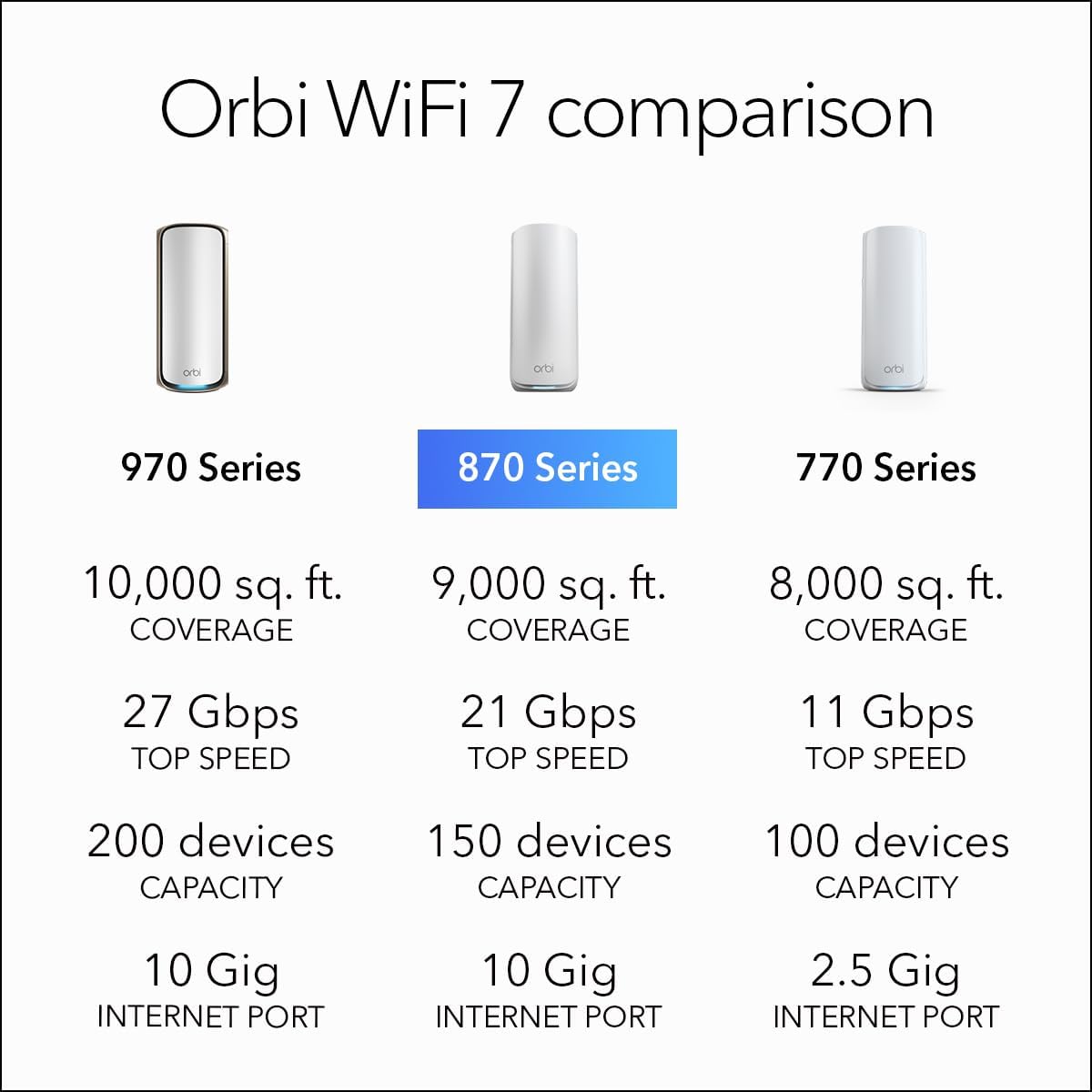 Orbi WiFi 7 is in a class of its own designed for a new era of entertainment hybrid work and smart home convenience. The Orbi 870 Series unlocks the power of WiFi 7 with speeds up to 21 Gbps 2.4X faster than WiFi 6. In addition the Orbi 870 brings exceptional 360 WiFi coverage across every corner of your home regardless of the layout from the front door to the back yard. It includes a 30-day trial subscription of Armor all-in-one security protection.