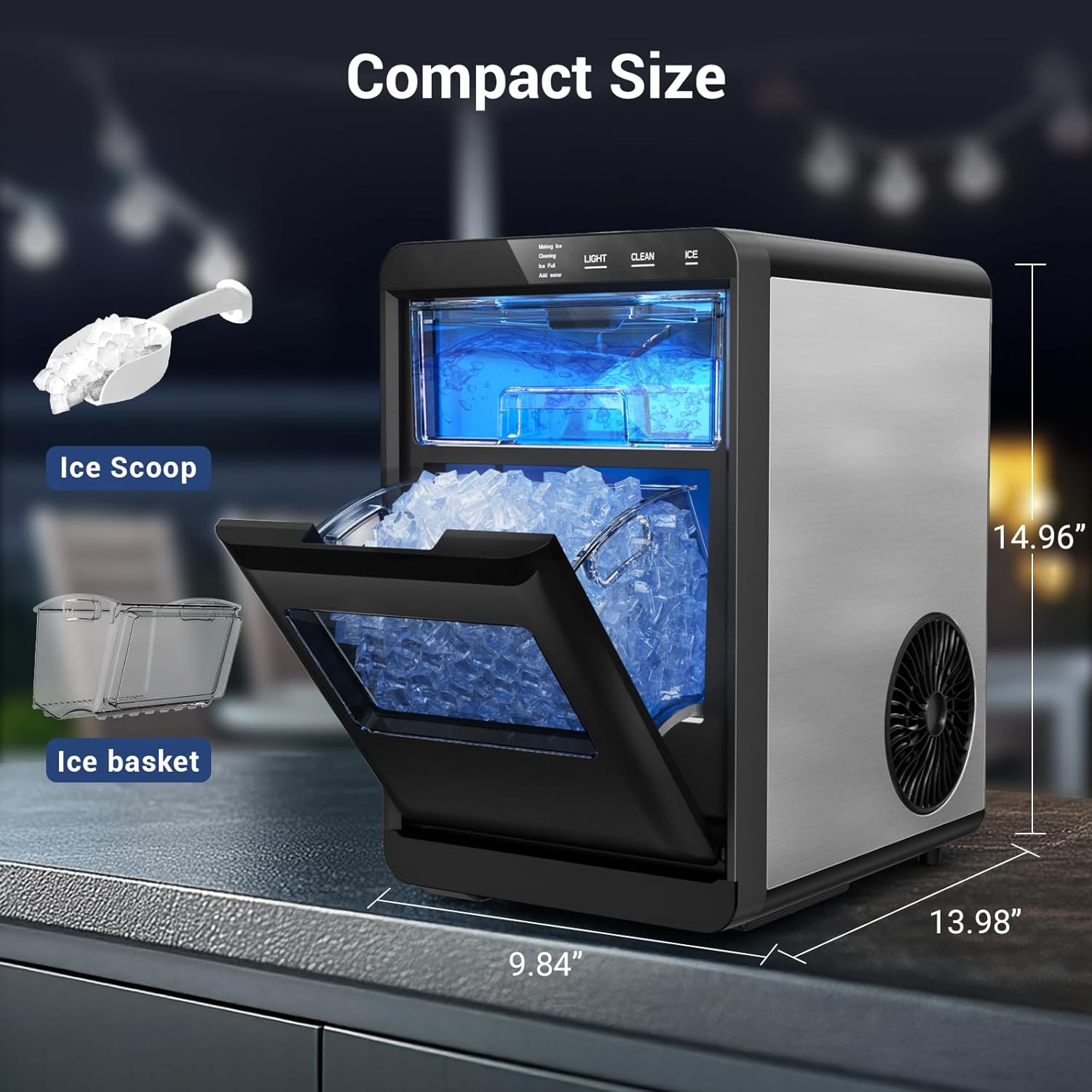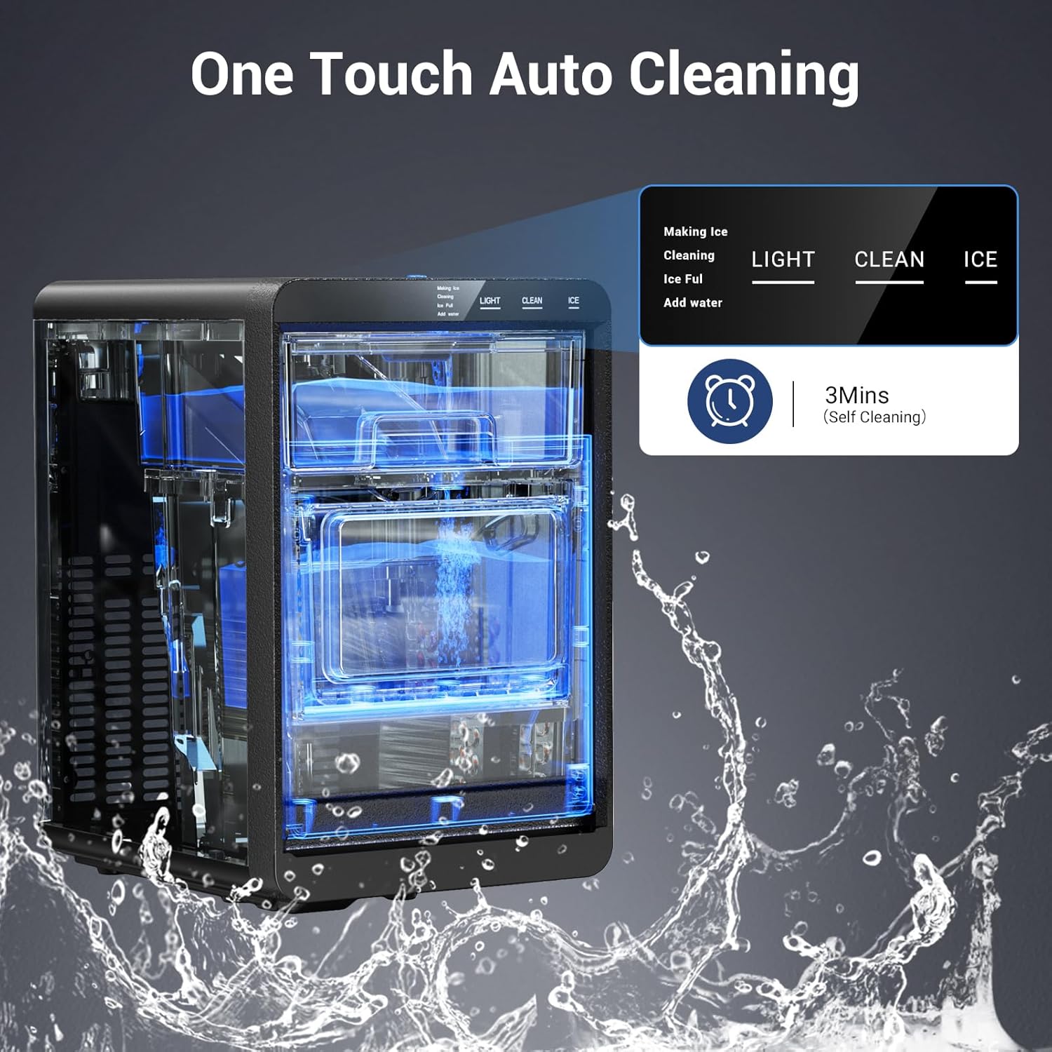 Automatic Cleaning & Low Noise Operation: With just a 3-second press of the cleaning button the nugget ice maker automatically starts a full self-cleaning cycle keeping your ice fresh and the machine running efficiently. Designed with upgraded silencer technology it operates at less than 50dBquiet enough for use in kitchens offices without disturbing your environment.