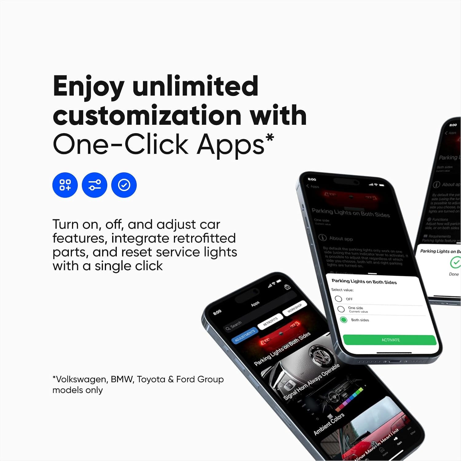 Unlimited maintenance retrofit and customizations with One-Click Apps: Access essential maintenance features like service resets battery registration and brake pad replacement mode. Upgrade your vehicle with pre-made coding options activate ambient lighting folding mirrors video in motion needle sweep and more. Integrate retrofitted parts or disable unwanted factory settings all in just a few taps no coding knowledge needed.