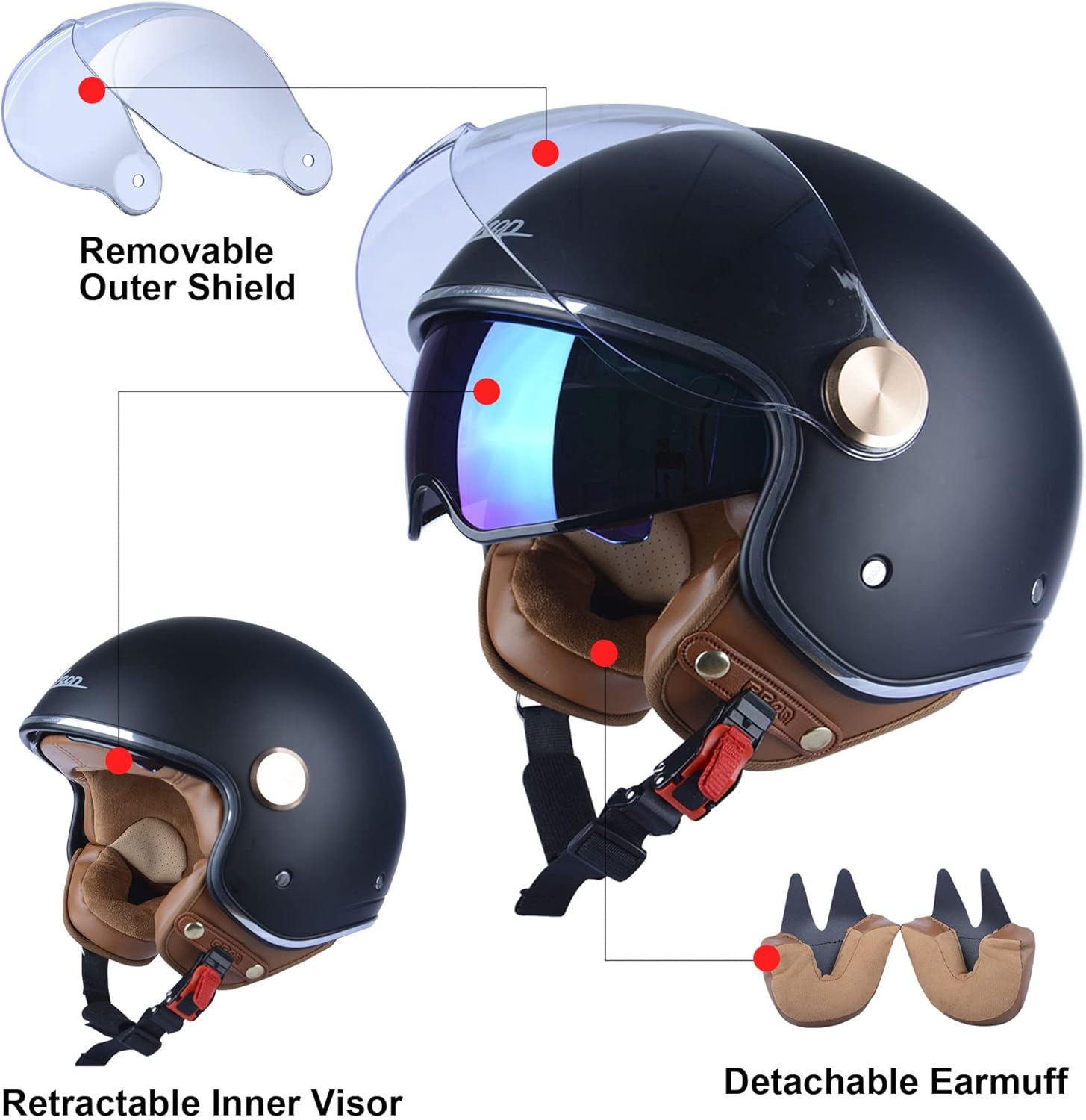 Multipurpose: Additional long outer visor is provided for better protection to face in high speed. This helmet is a good retro style choice for adults riding on motorcycle motorbike cruiser chopper scooter cafe racer and street bike for daily commute touring or city cruise