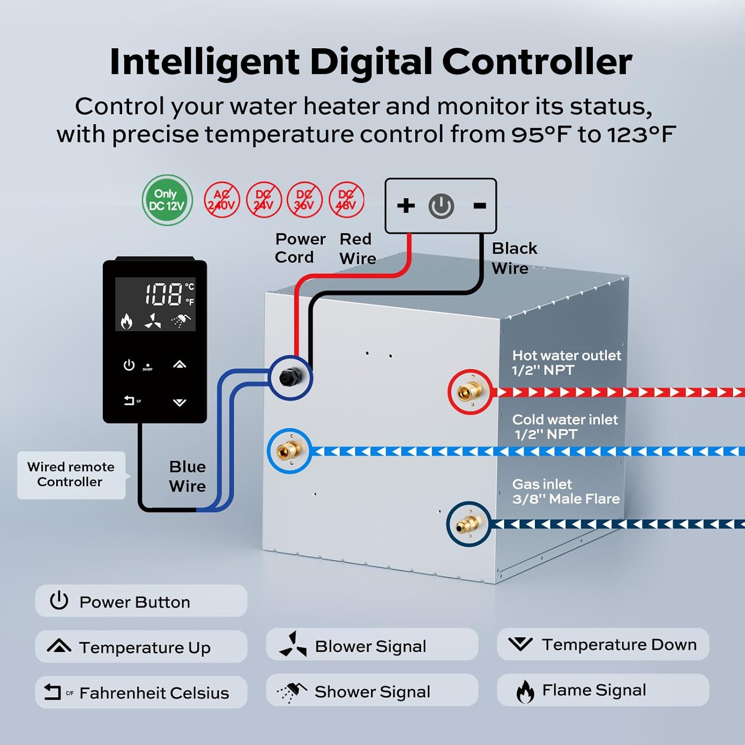 : has always thought of you featuring a built-in high-quality 150 PSI pressure-reducing valve so you don't need to make additional purchases or visit hardware stores frequently saving you time and money. The smart remote control effortlessly adjusts water temperature from 95F to 123F. It also displays error codes for quick troubleshooting making operation simple and stress-free