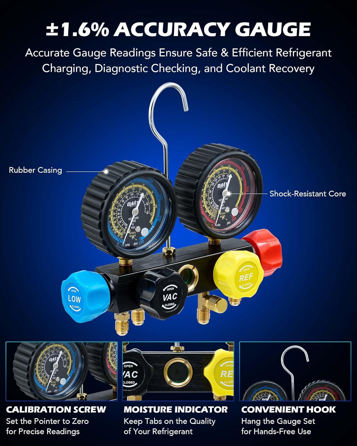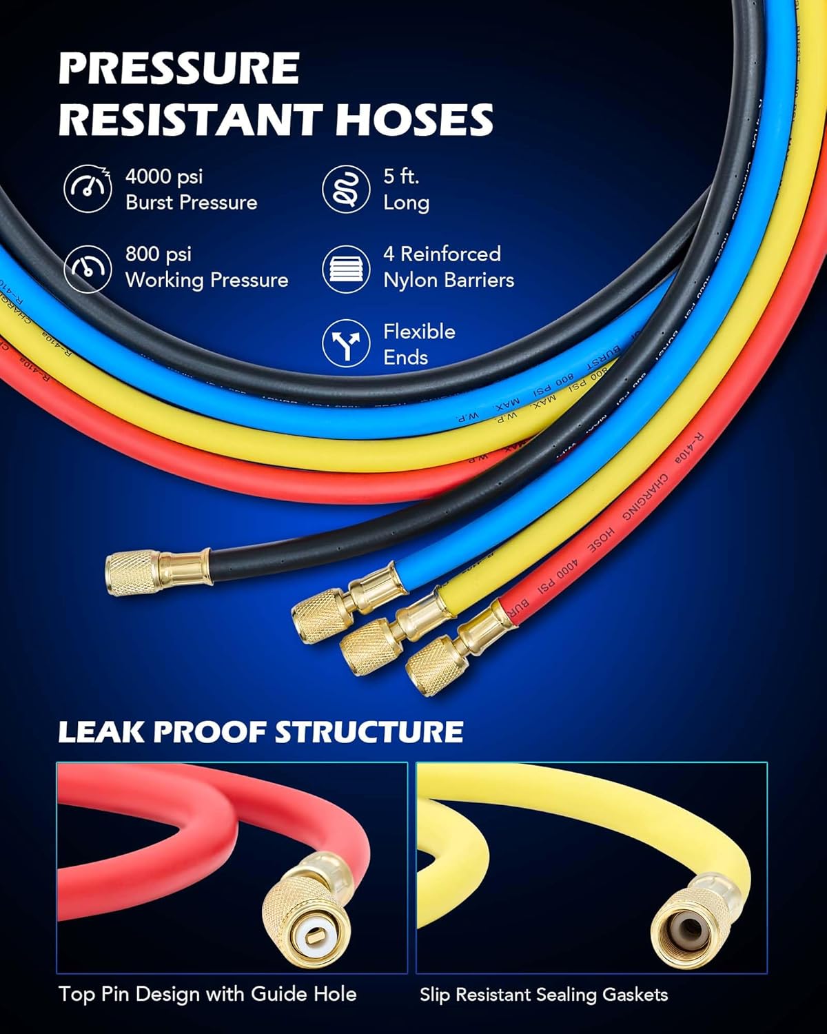 High Accuracy Gauge Set: The AC manifold gauge provides precise real-time monitoring of your coolant's condition; the color-coded charging hoses are constructed with four layers to withstand pressures up to 800 psi (with a burst pressure of 4000 psi)