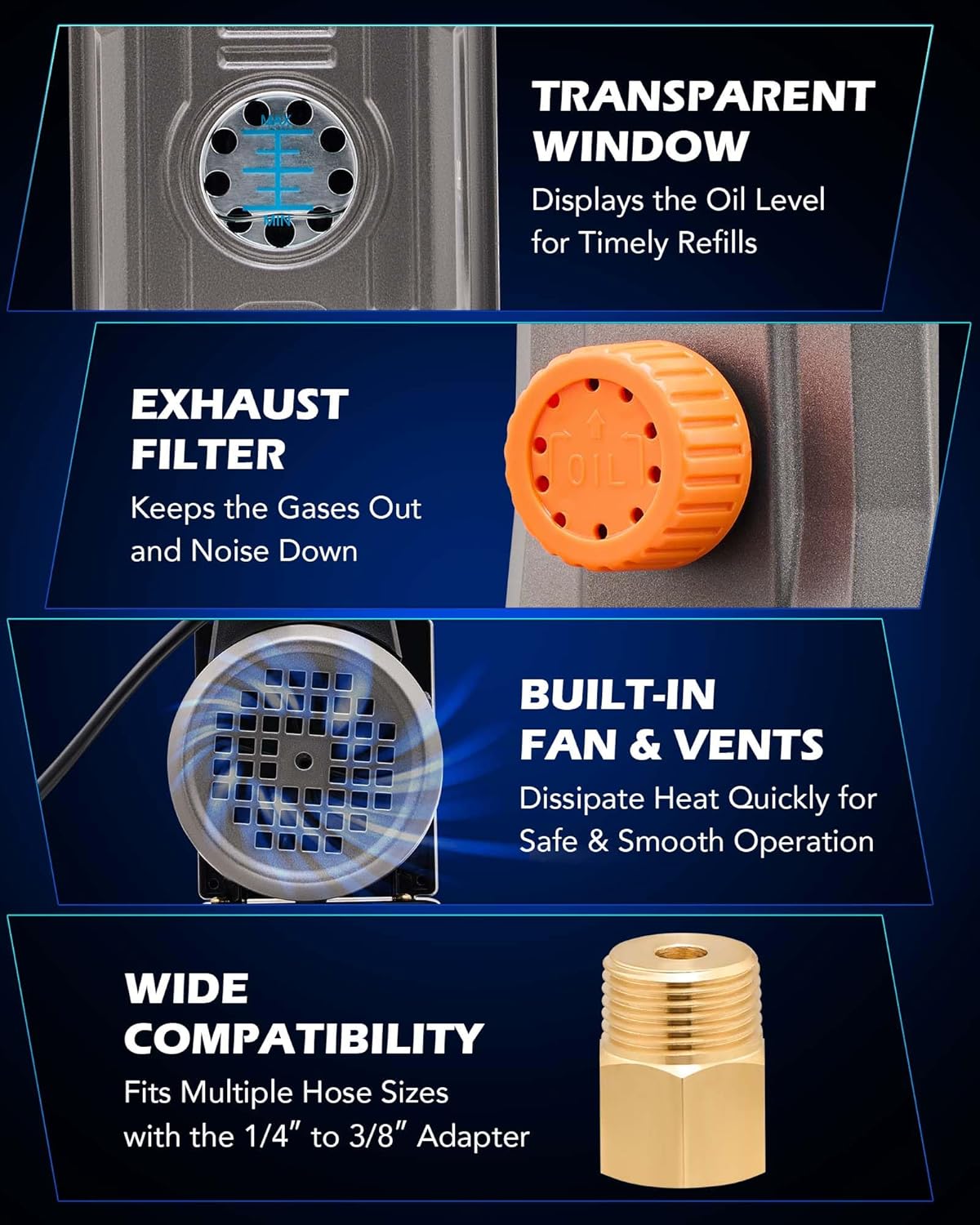User-Friendly Designs: Efficiently manage heat with the built-in cooling fan monitor oil levels easily with the sight glass and ensure swift oil emptying through the bottom drain valve. Includes 0.26 qt. of vacuum oil for added convenience