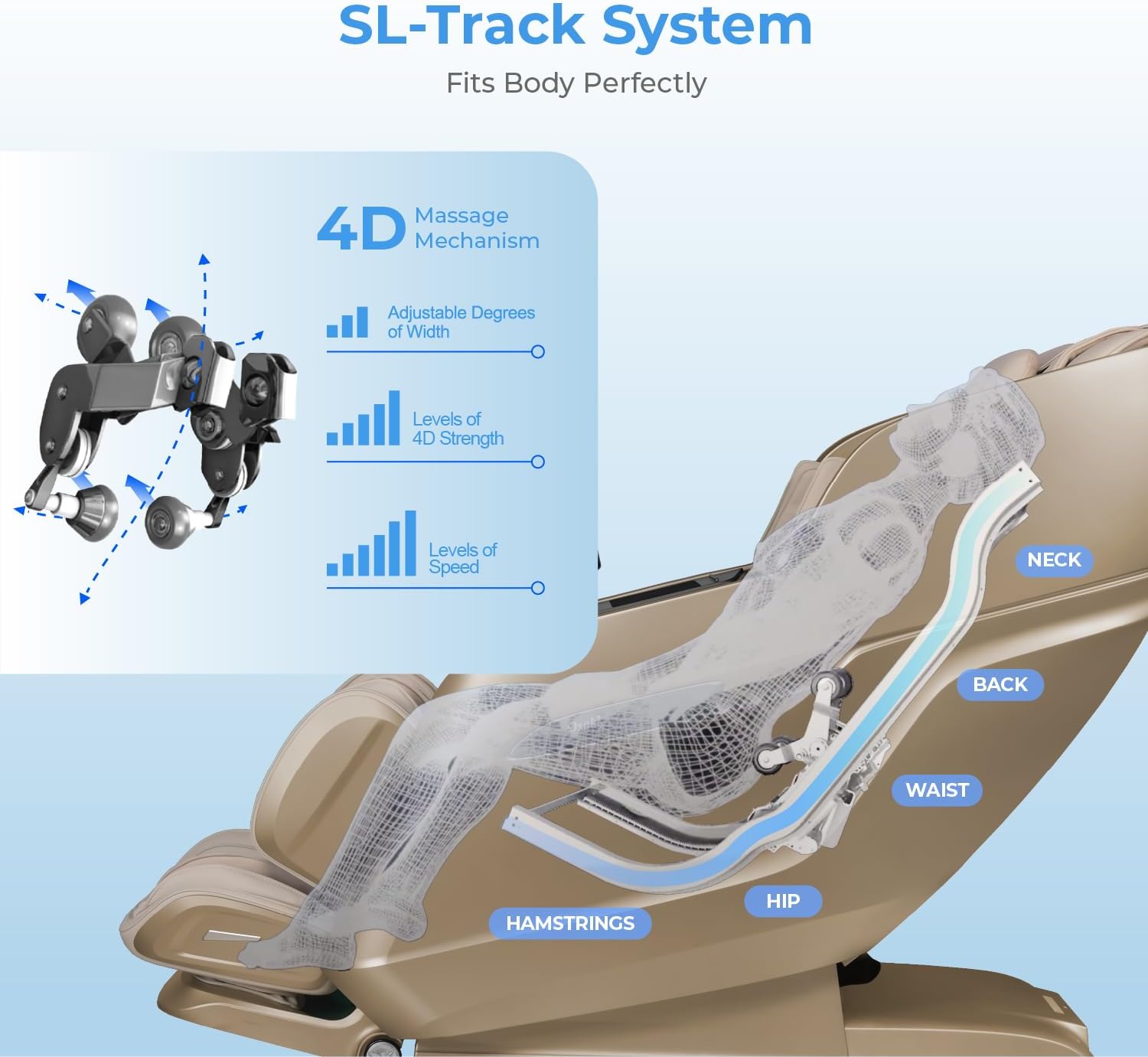 Advanced 4D Massage Mechanism with Precision Targeting Our cutting-edge 4D massage technology simulates human-like hand movements with adjustable speed depth and rhythm. The system allows for multidirectional movement that reaches deep muscle layers offering therapeutic relief for tension stiffness and chronic muscle fatigue.