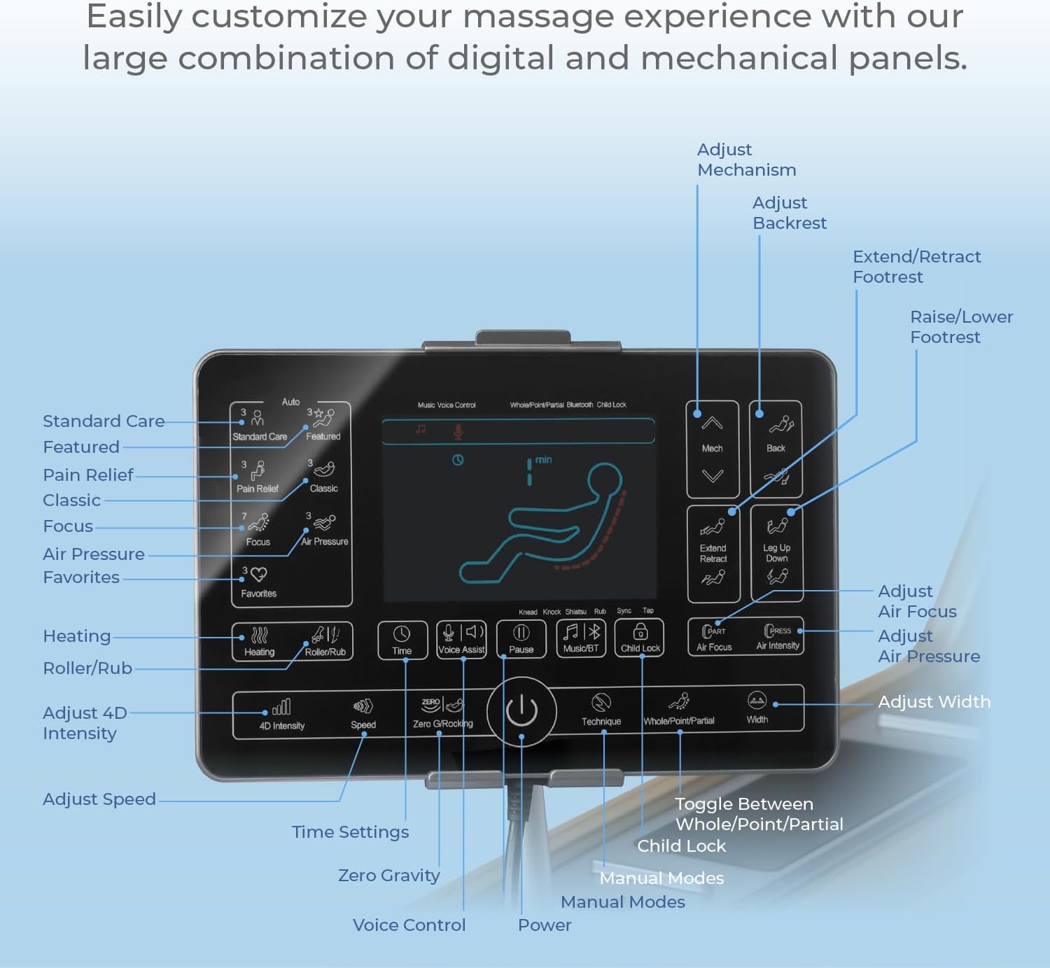 19 Auto Programs & 6 Manual Modes for Total Customization With 19 expertly designed auto massage routines including recovery stretch deep tissue and relaxation plus 6 manual techniques such as kneading tapping and shiatsu you can personalize your massage to match your needs schedule or mood at any time.