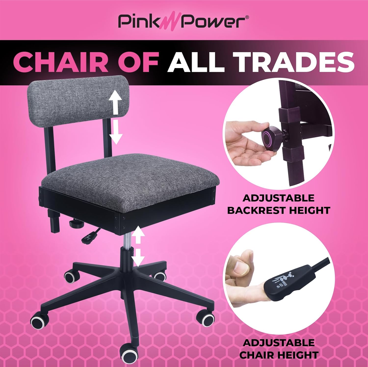 Move Around: Fit crafters love to do multi-tasking with this five-star 360 swivel base for greater movement and stability. Heavy-duty casters roll smoothly on most floors with this adjustable sewing table chair with wheels.