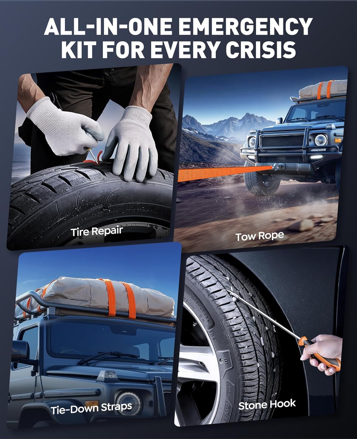 16-IN-1 ROADSIDE EMERGENCY CAR KITTK20 jumper starter portable can not only easily start a vehicle and tire inflation it is also a multifunctional car emergency kit. It includes tire repair tools 2-in-1 stone hooks tow-ropes luggage straps a safety hammer 400V insulated gloves and more. Handle tire repair towing securing cargo or emergency escape with one kit. No need to waste time searching for separate toolsthis kit will be your reliable companion whenever you hit the road.