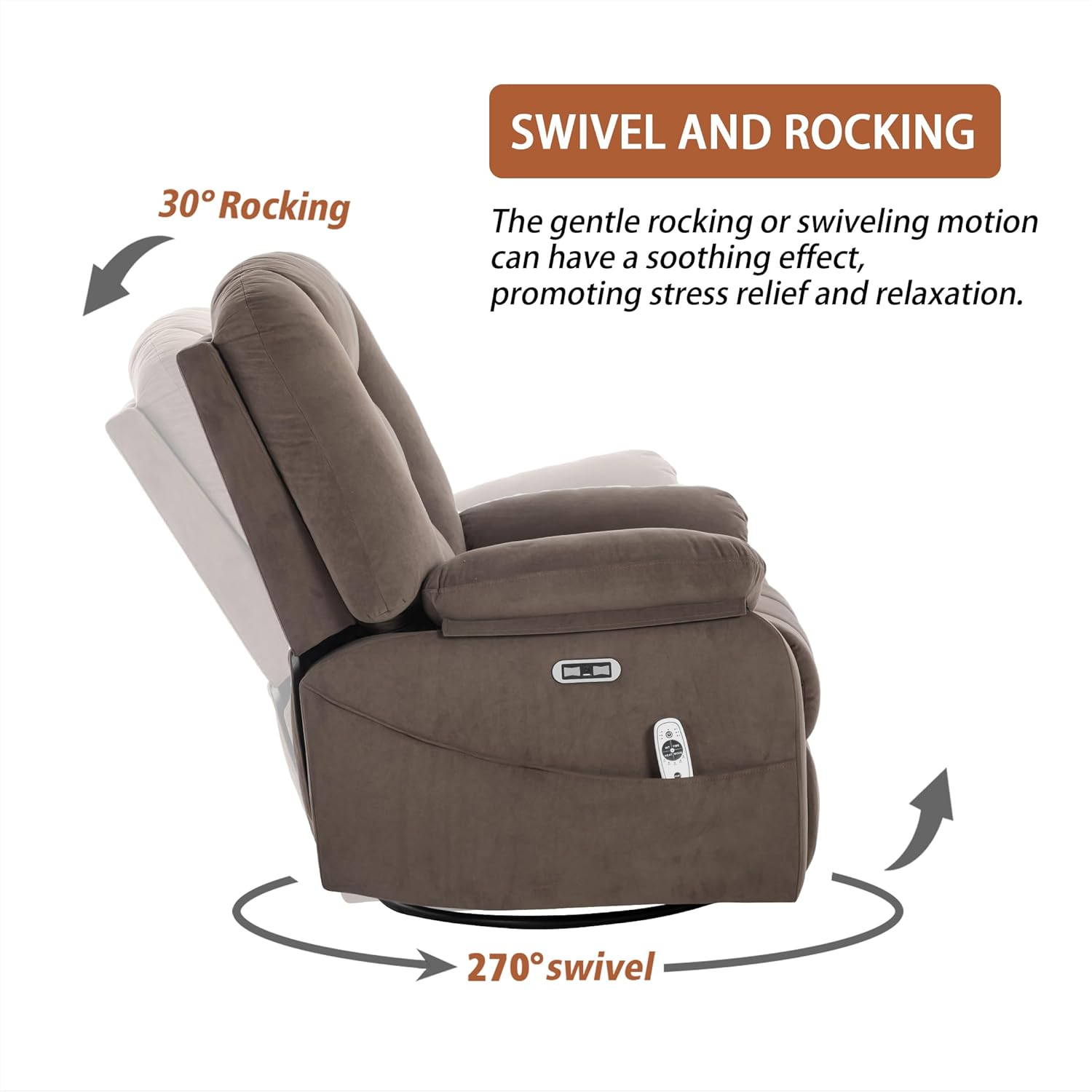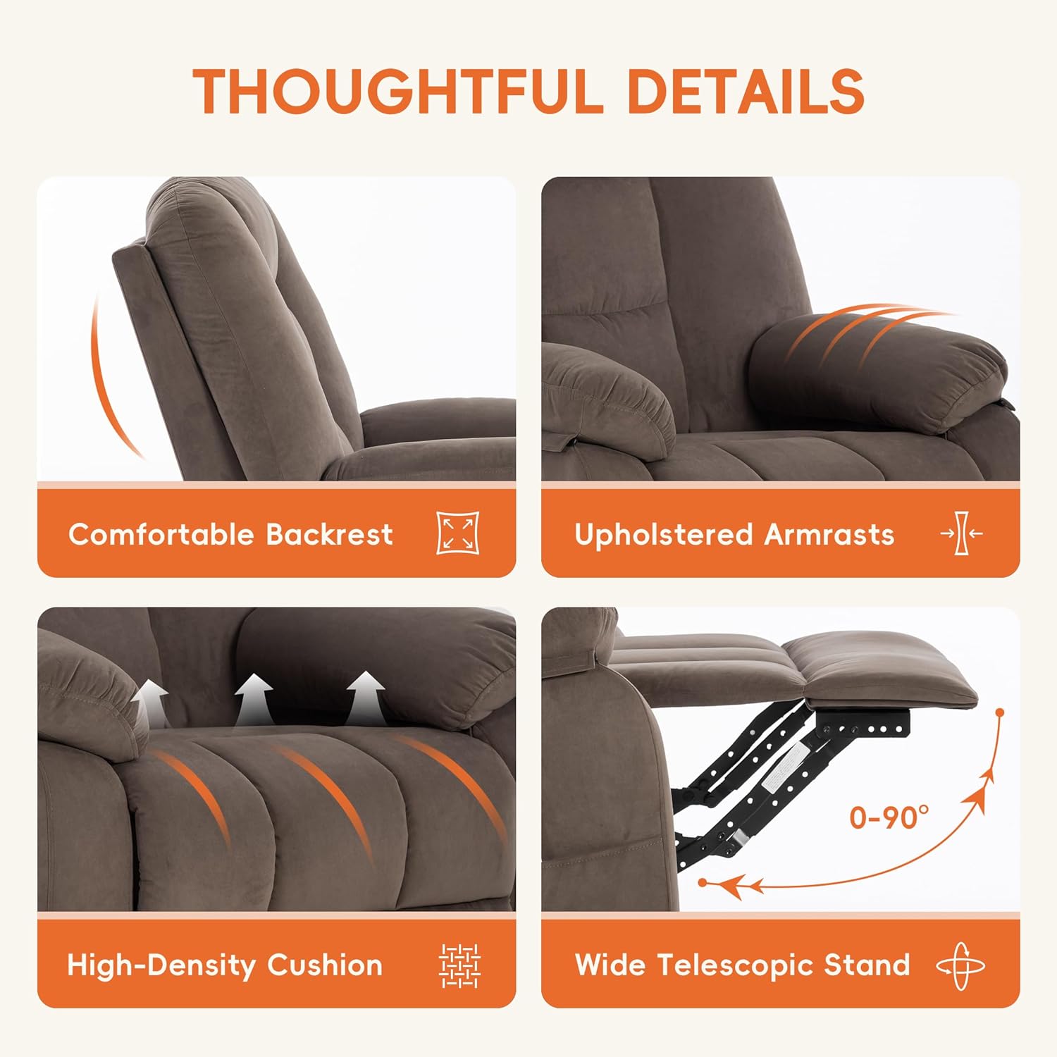 Velvet Comfort That Looks as Good as It Feels:Wrapped in ultra-soft velvet fabric, this recliner adds a plush, cozy touch to your living room or bedroom. The elegant finish and inviting texture make it both a visual and tactile upgrade to your space.