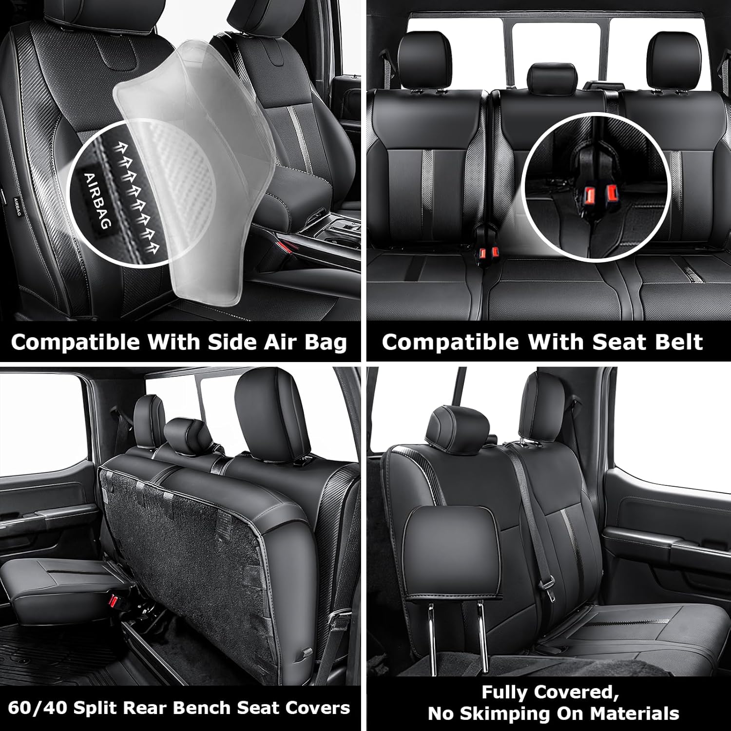 KEEP SAFETY : Our full set F150 truck seat covers are designed to be compatible with side airbags and seat belt ensuring that your F150 safety features are not compromised. Overall these seat covers are a must-have for any F150 owner who wants to keep their vehicles interior looking new and protected while also ensuring the safety of the passengers.