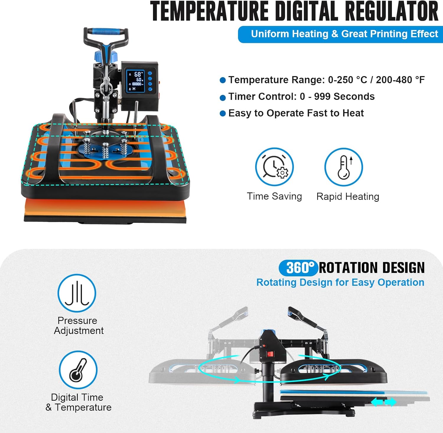 360 Rotation and Guide Rail Design -- With a fully rotated 360 degree swing-away and bottom guide rail design allows the heating element to be moved safely aside reducing the chance of accidental contact also make it easy to replace the plate press and hat press. The bottom strong base and top pressure knob make it more stable when using this heat press machine provides a full range press directly and evenly guarantees the quality of finished transfers.