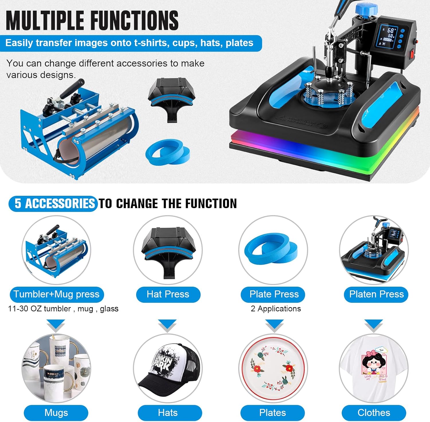 Wide Range of Uses -- T shirt pressing machine combo can be used for T-shirts caps ceramic plates hats ceramic tiles mugs coasters mouse pads jigsaw puzzles lettering and other flat items. Suitable for ceramics glasses and textiles such as cotton flax chemical fiber nylon etc. Different sizes of mug presses in the package could meet different transfer demands for you. Adaptable to your various individual needs.