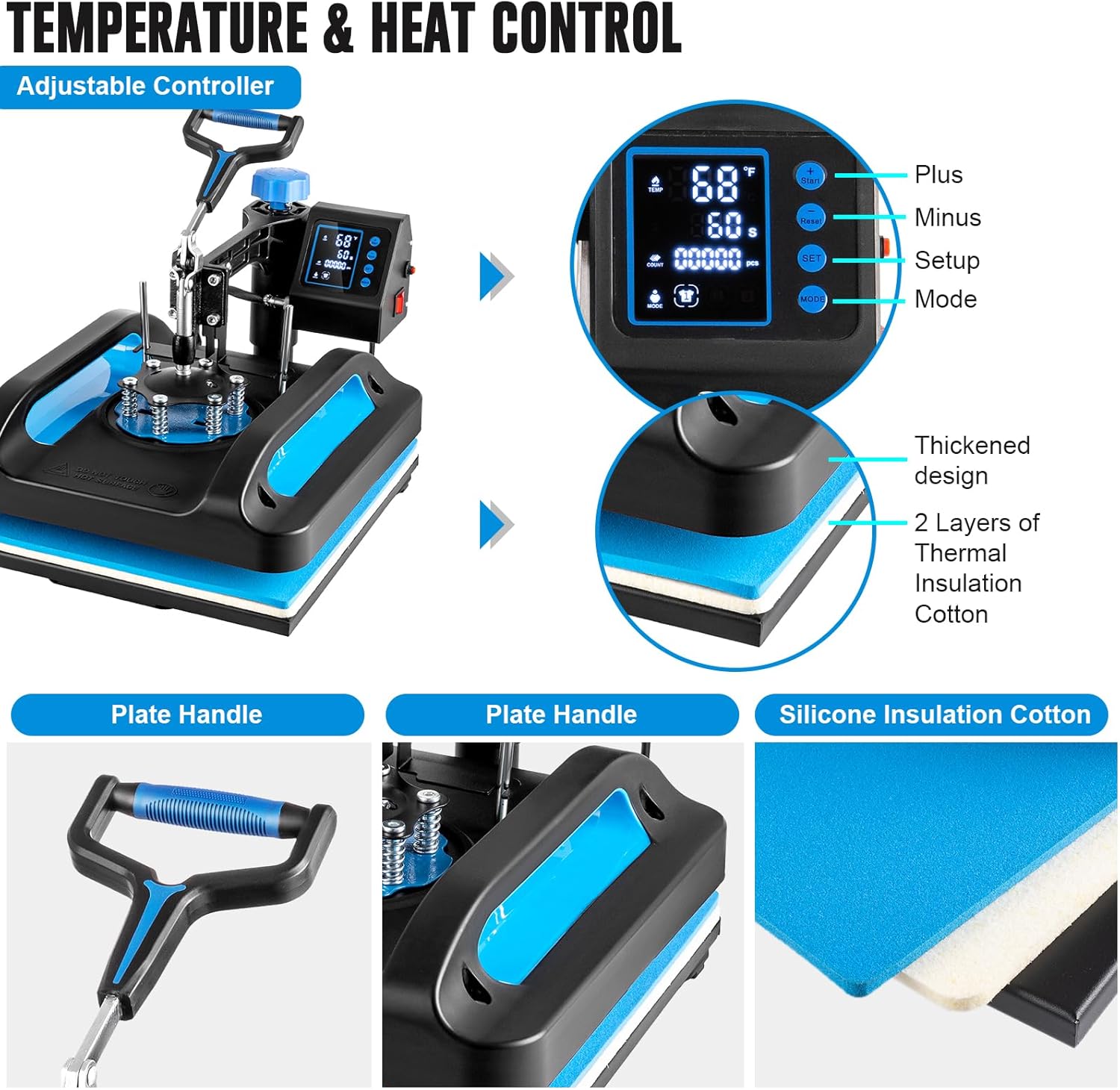 Fast Heating & Double Tube -- Heat Press Machine 15x12 is equiped with advanced die-cast aluminum heating plate with non-stick Teflon-coated surface It effectively prevents scorching during the heat transfer process. This coating is heat resistance easy to clean and can make printing more steady. Two bonus teflon sheets can protect your vinyl clothes while working. The bottom thickened silicone pad and sponge pad ensure more flat and even pressing.