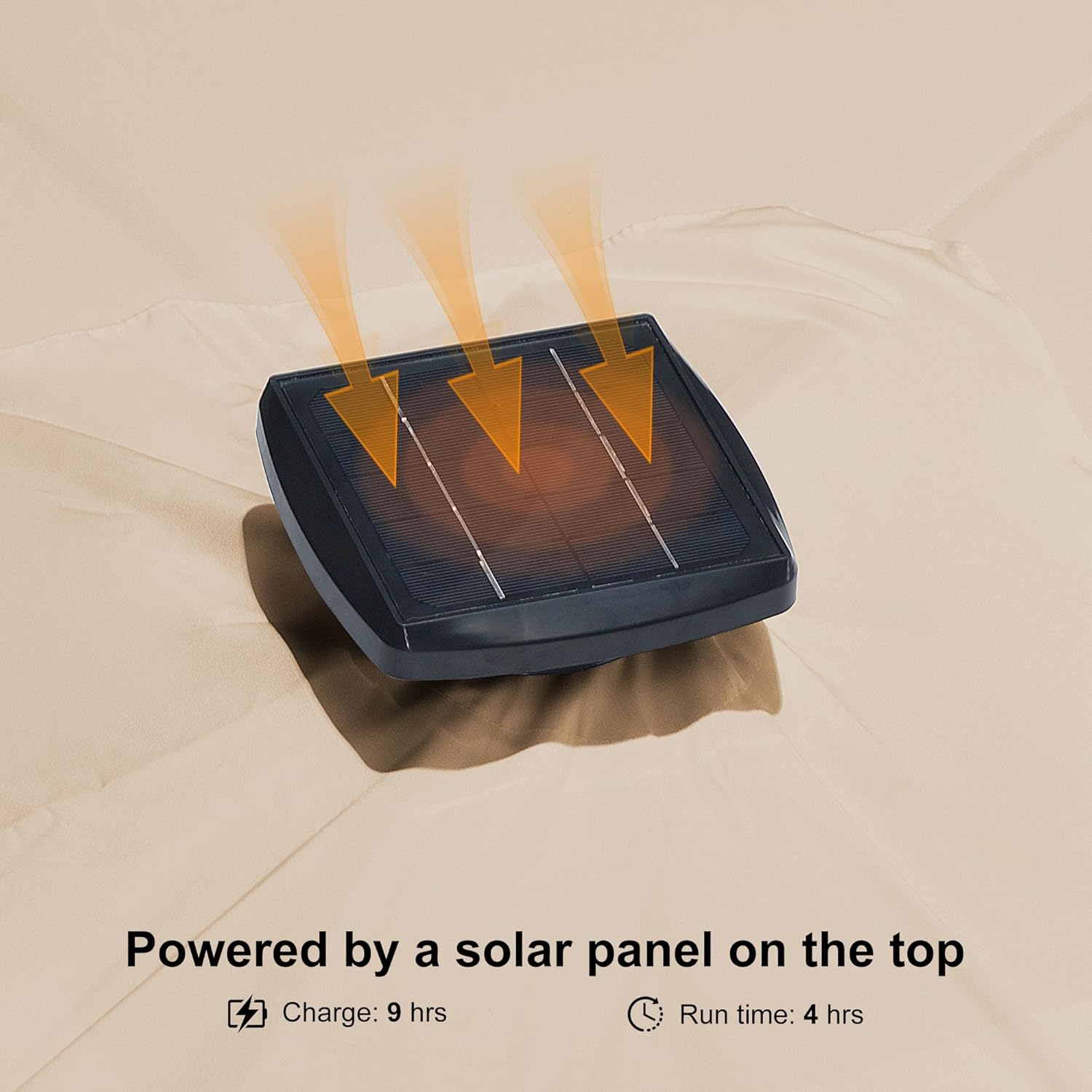 Powder coated all-aluminum umbrella bones and 8 heavy-duty ribs and comes with led lights that is powered by a solar panel on top design for durability and enjoyment for outdoor use.
