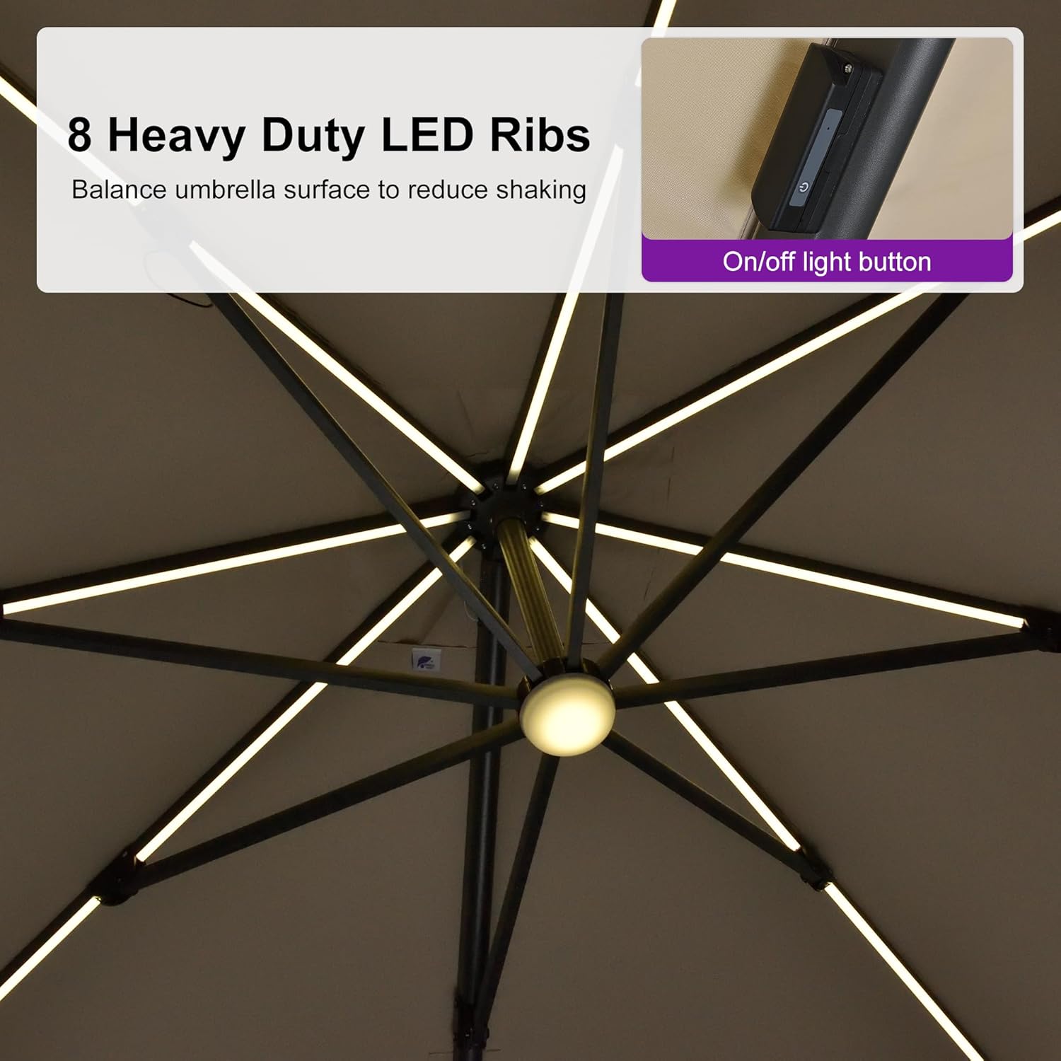1240 GSM Polyester Fabric2360 Rotation System38 Heavy Duty LED Ribs45 Tilt Function5Cast Aluminum HandleWith an extra-wide canopy reinforced pole and 360 swivel handle this umbrella offers effortless shade controlwhere luxury meets practicality.