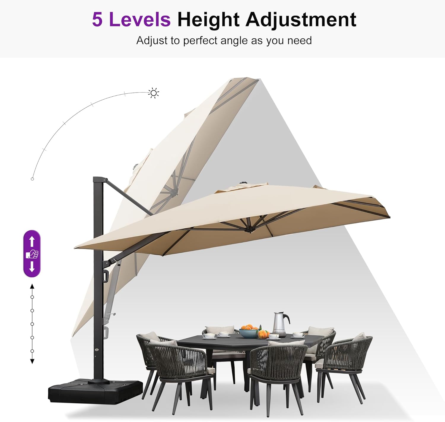 This paito umbrella has unique handle design and crank system 5 height and angle to choose 360-degree rotation for easier shading area control