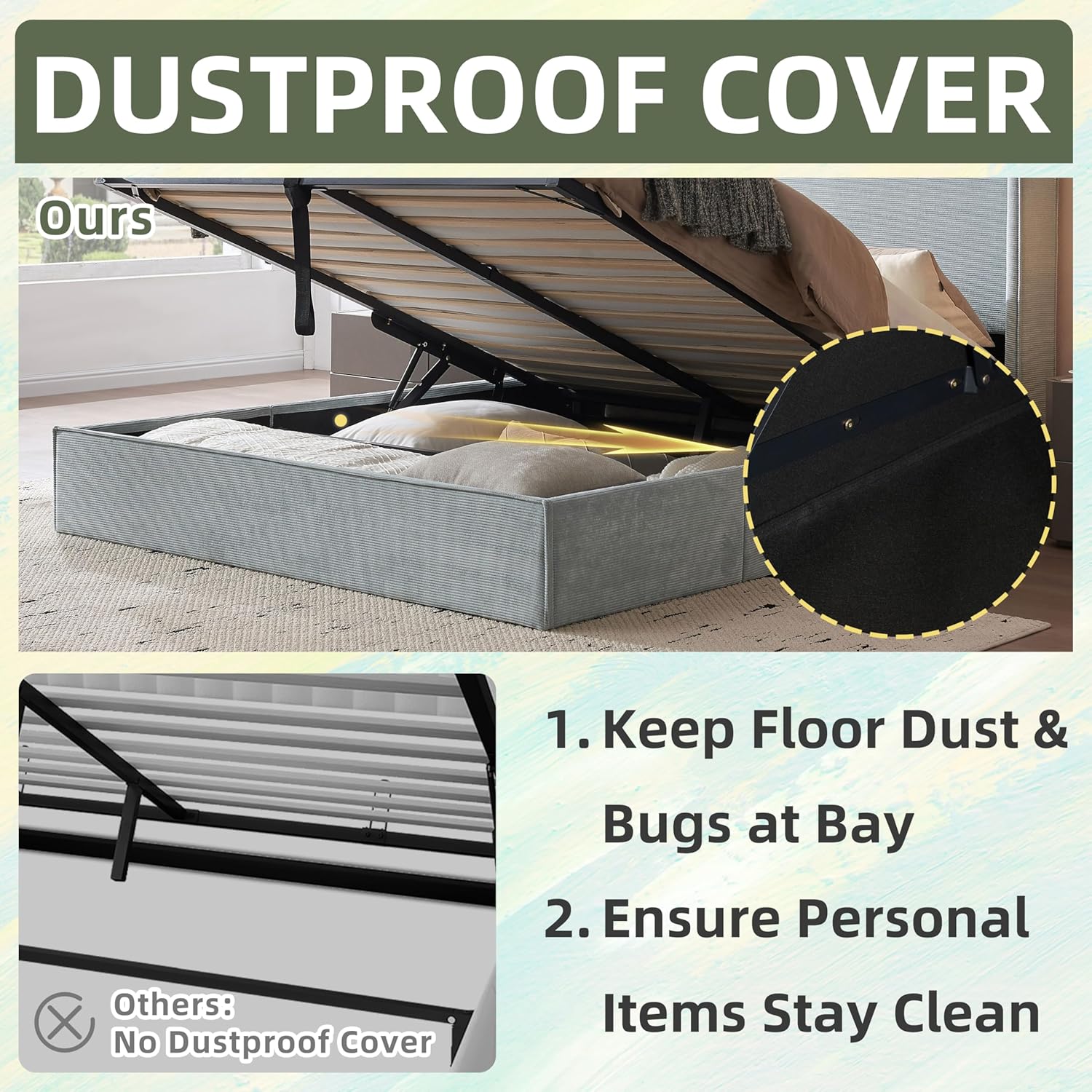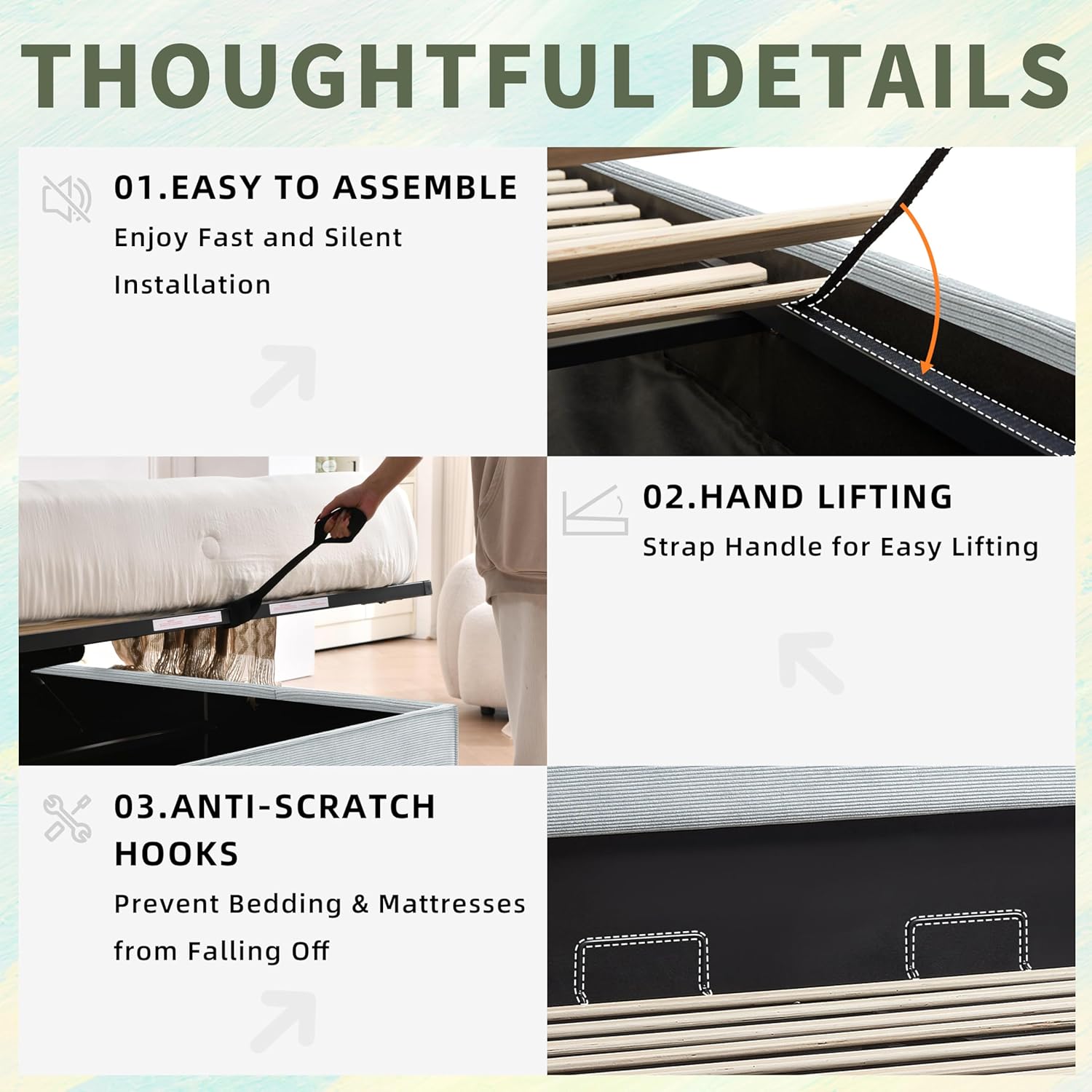 Dust-Free Storage: At the foot of the upholstered bed frame queen, there's a sturdy nylon rope that assists in easily lifting the hydraulic system, providing convenient access to stored items. Combined with the black dust-proof fabric at the bottom of the bed, it ensures your underneath storage space remains clean and free from dust