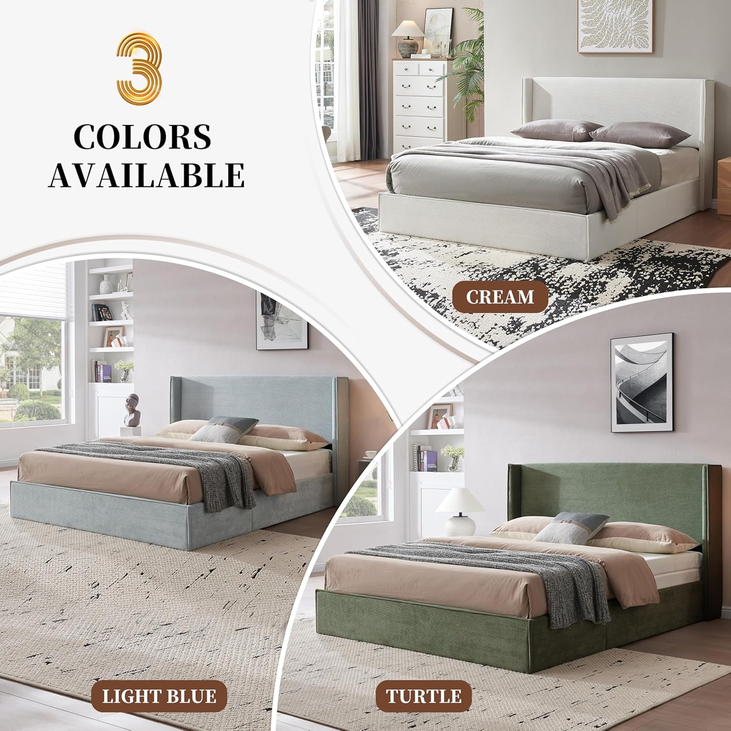 Multiple Color Choices: Available in cream, turtle, or light blue, our hydraulic lift up storage queen provides various color options to match your bedroom decorcream bed frame for a bright, airy feel. turtle for a touch of nature. or light blue bed for serene tranquility