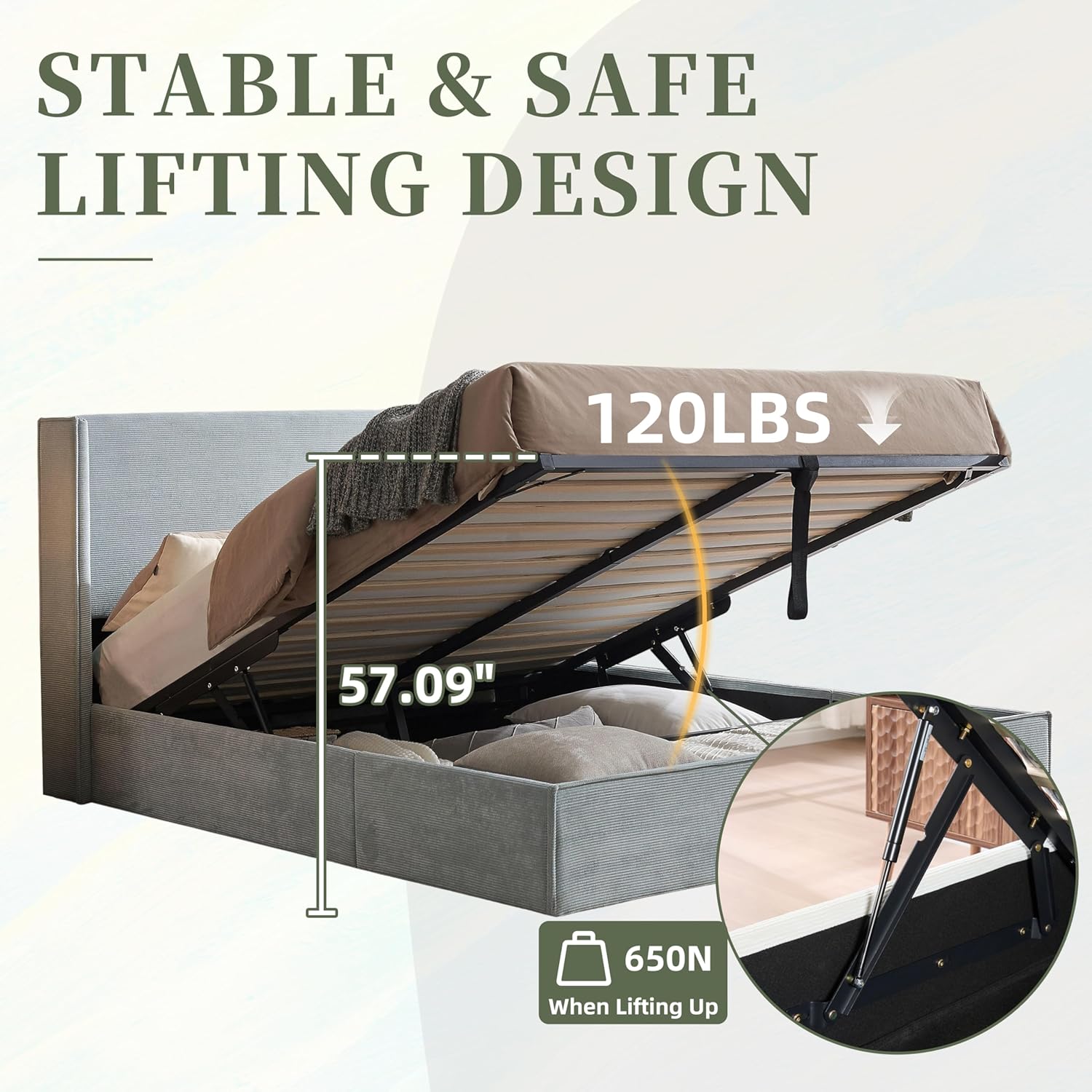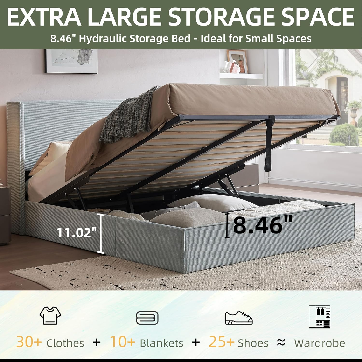 Spacious Underneath Storage: Our queen bed frame with storage features a hydraulic lift system that easily raises, revealing an 8.46" deep storage compartment. This bed with underneath storage provides ample space for storing extra bedding, clothing, and other items, making it ideal for small bedrooms or apartments