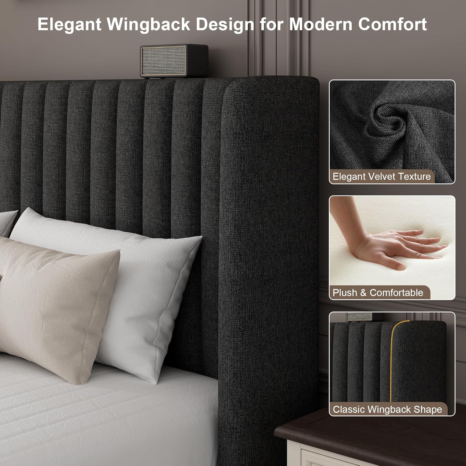 Luxurious Linen Upholstery: Crafted with breathable premium linen fabric and thick cushioning this bed adds refined comfort to your bedroom. The wingback headboard offers ergonomic support for reading or lounging blending timeless elegance with modern functionality