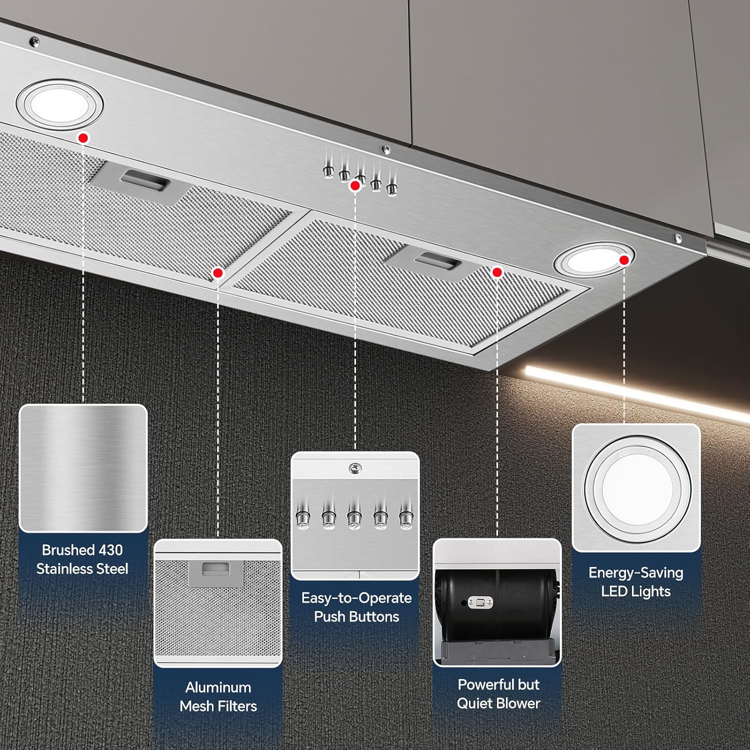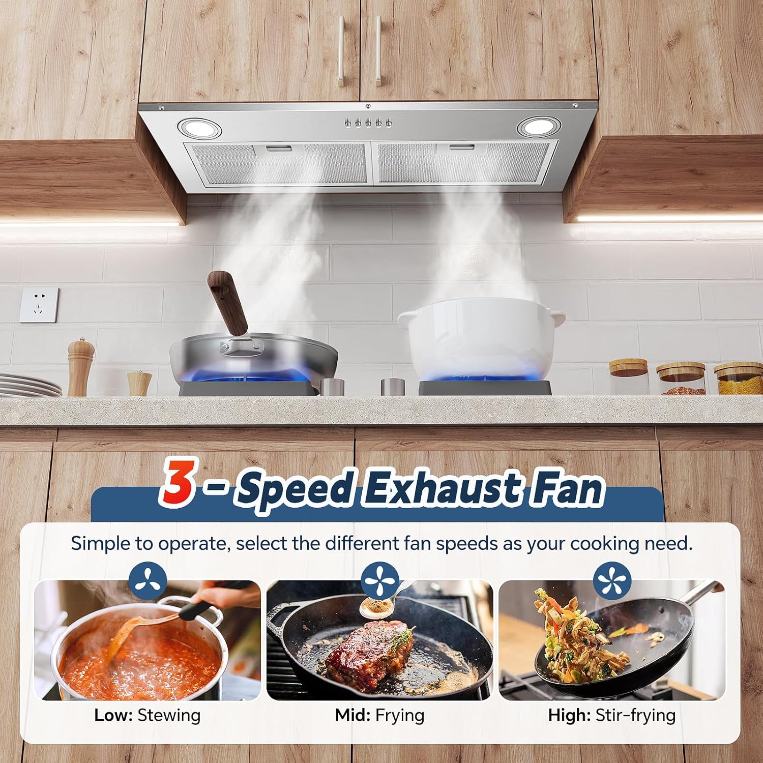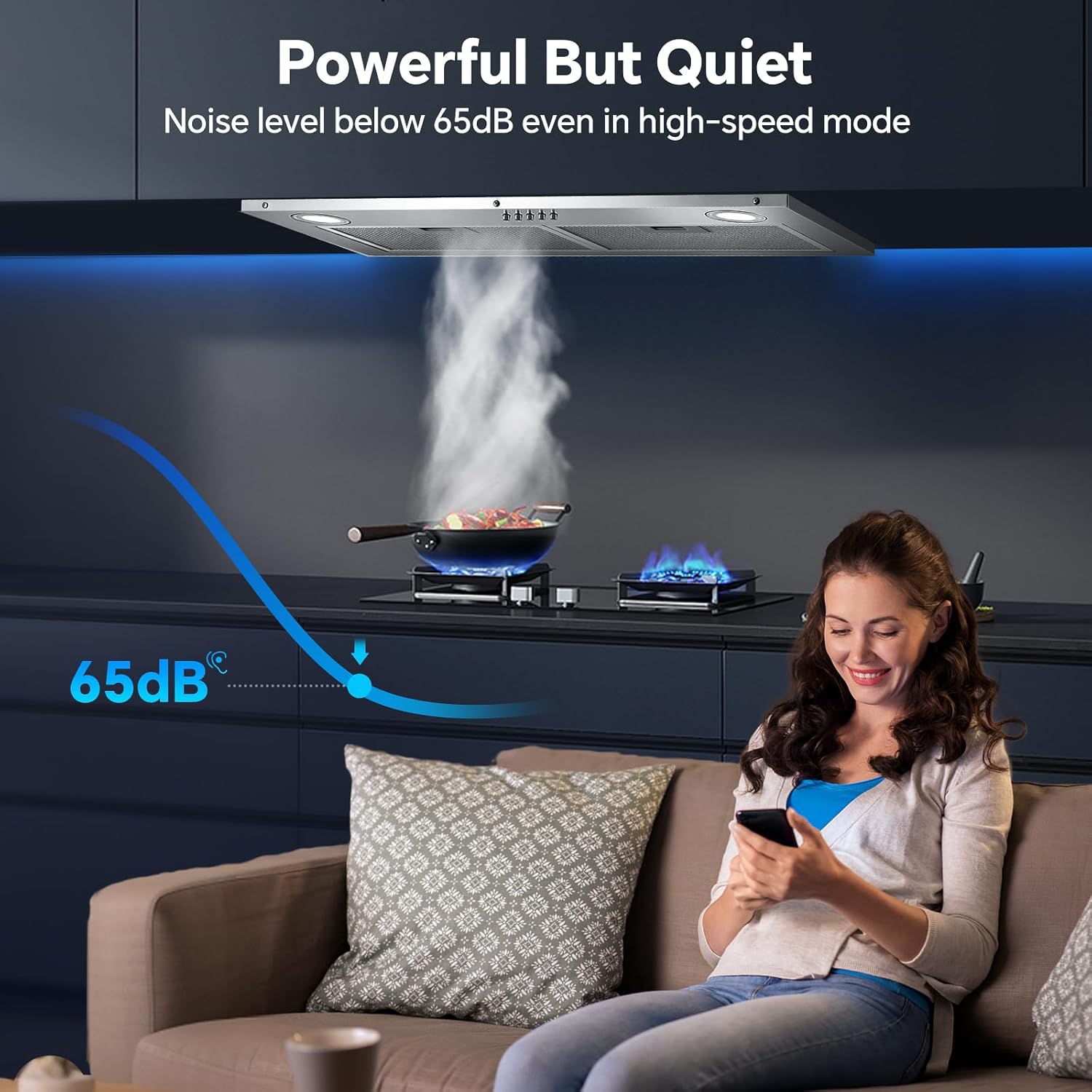 Powerful 600 CFM Performance: Three adjustable speed settings adapt to various cooking intensities; Achieves thorough smoke extraction for range hood 30 inch wide; Operates below 65 dB for quiet stove hood ventilation