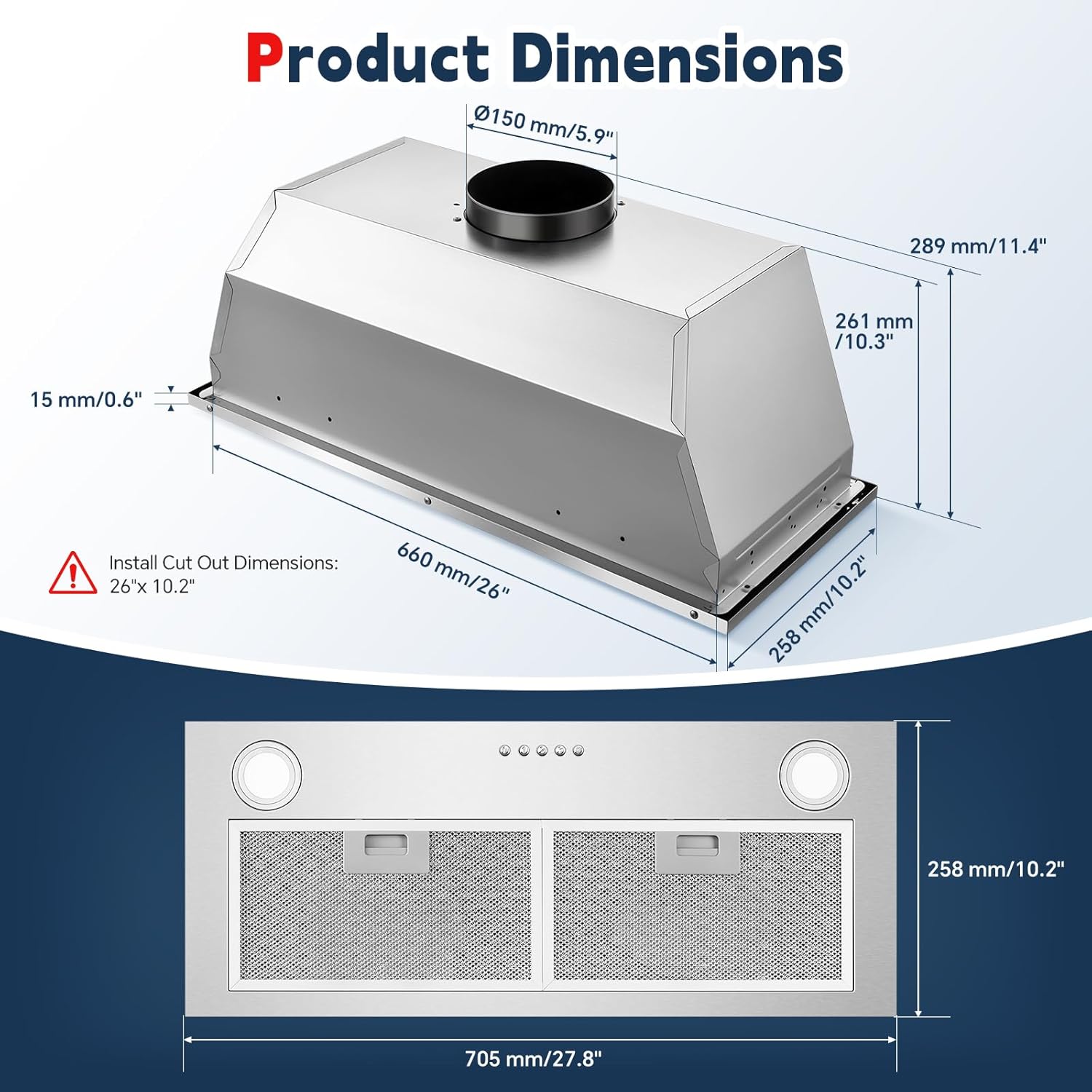 Insert range hood: Product Dimensions: 27.8 inch(W) x 11.5 inch(D) x 10.3 inch(H); Install Cut Out Dimensions: 26 inch(W) x 10.2 inch(D); electrical requirements: 120V/60Hz 3 Prong Plug. A protective blue film is included to prevent the range hood scratches during shipping