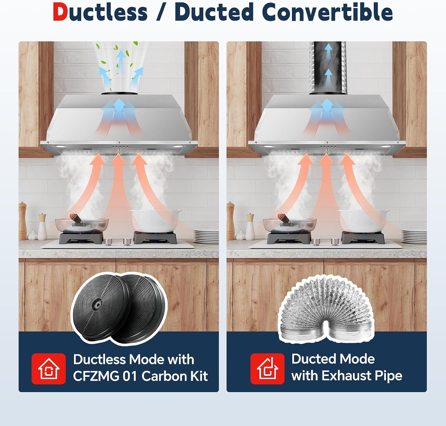 Flexible Installation Options: Includes 6-inch aluminum ducting for standard vent hood configuration; Convertible to ductless range hood using optional CFZMG01 charcoal filter; Detailed cutout dimensions (26 inch x 10.2 inch) ensure perfect fit