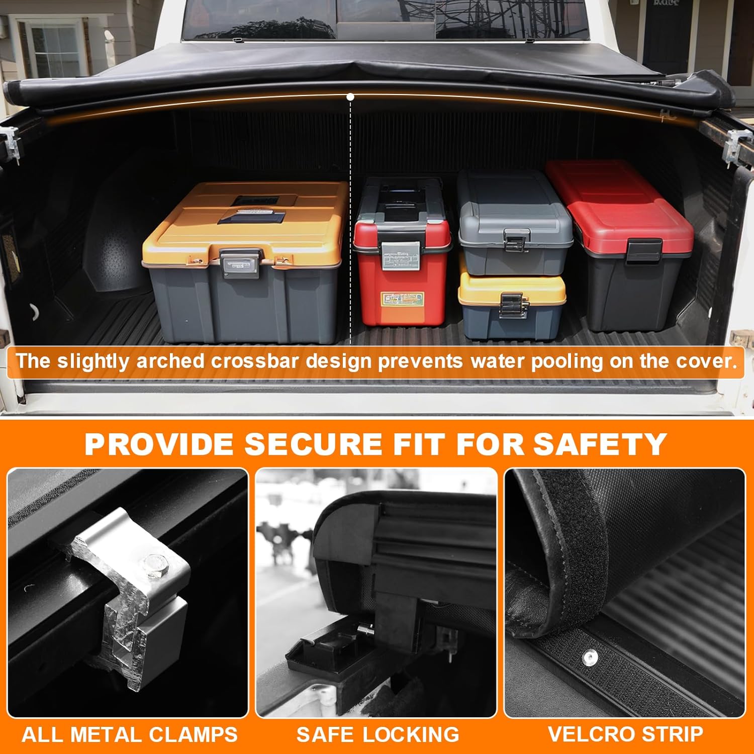 LATCH-LOCKING SYSTEM: The dodge ram 1500 bed cover features side seals with Velcro strips and robust all-metal clamps for a tight and secure fit. Its crossbars are slightly arched creating upward support and tension from beneath to effectively prevent water pooling and keep the cover wrinkle-free.