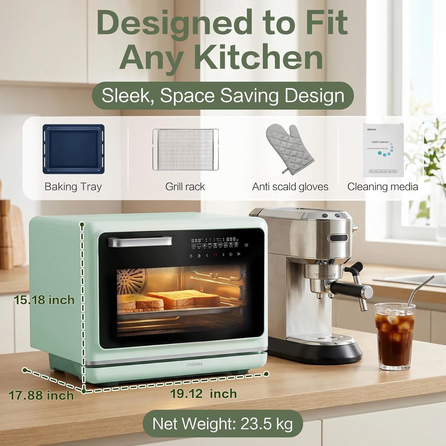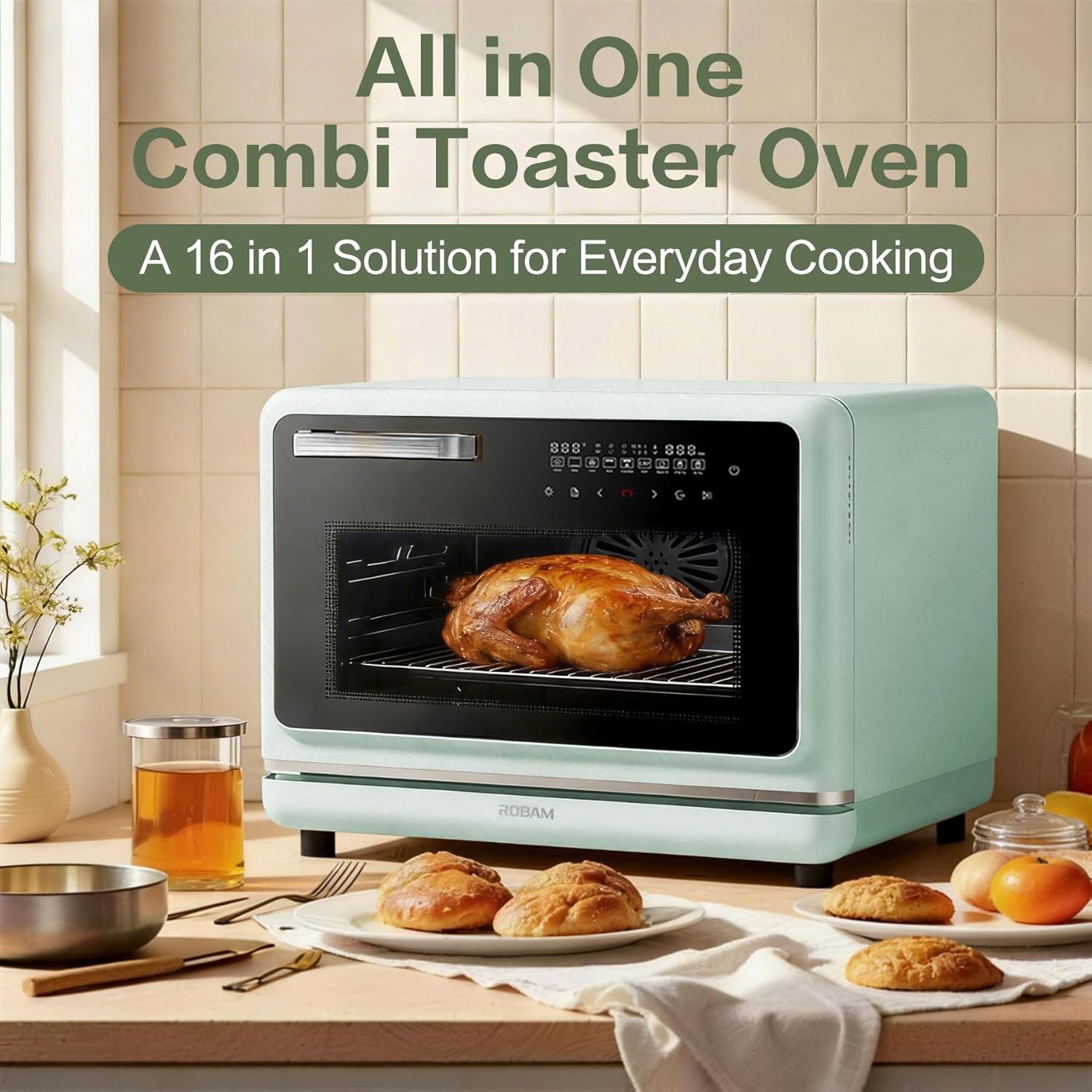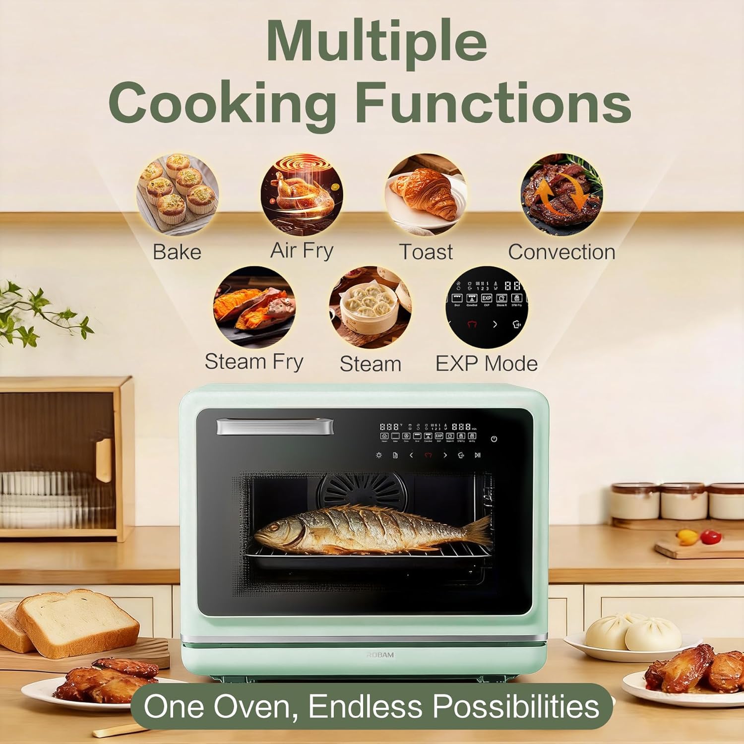 • Toaster Air Fryer Steam Oven Combo, Countertop Convection Cooker with Fry & Bake, 1.2 Cu.Ft Large Capacity Combi Oven, Smart Touch Precise Temp Control, Multi-Stage, 32 Preset Recipes (Green)