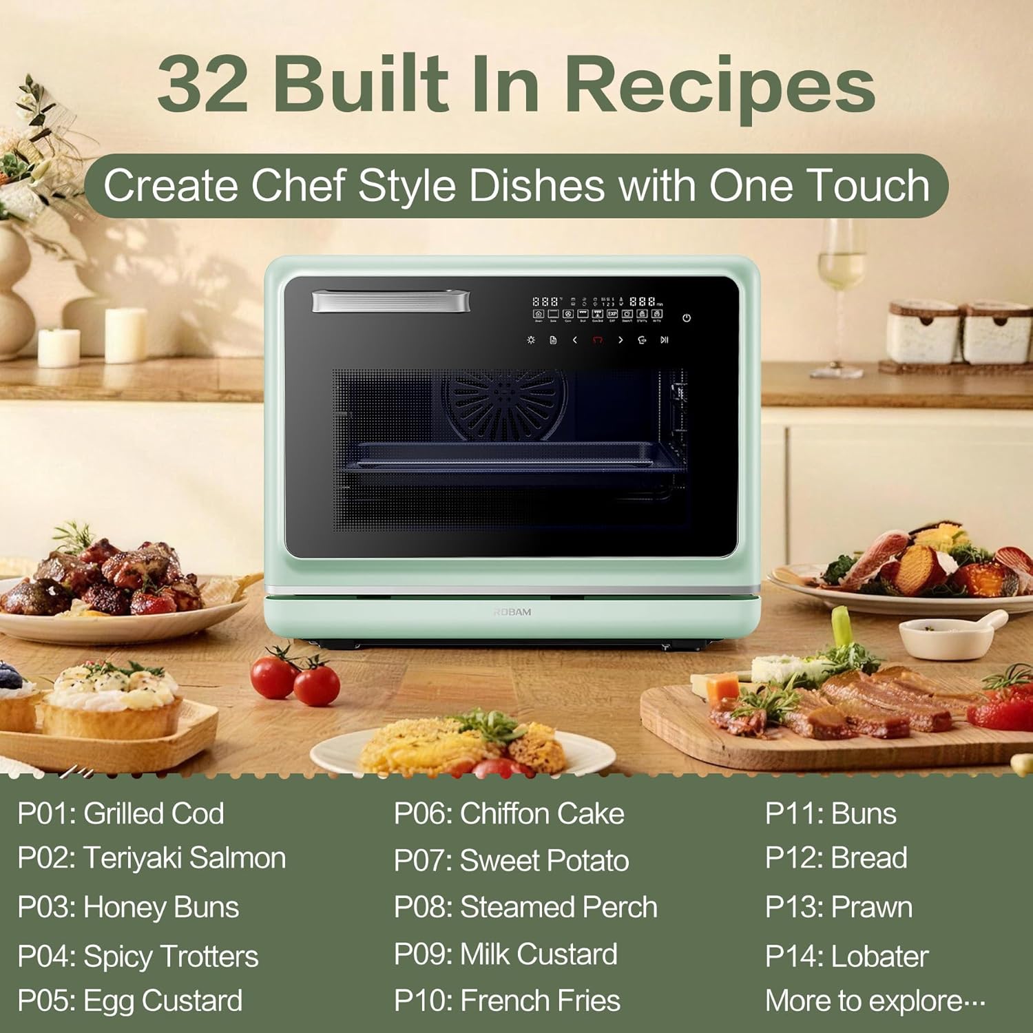 [Smart Digital LED Panel with 32 Preset Recipes] Precise steam temperature control is delivered through an easy smart digital control panel featuring 32 built-in recipes, handling toast, slice heating, fries, seafood, desserts, and healthier everyday meals