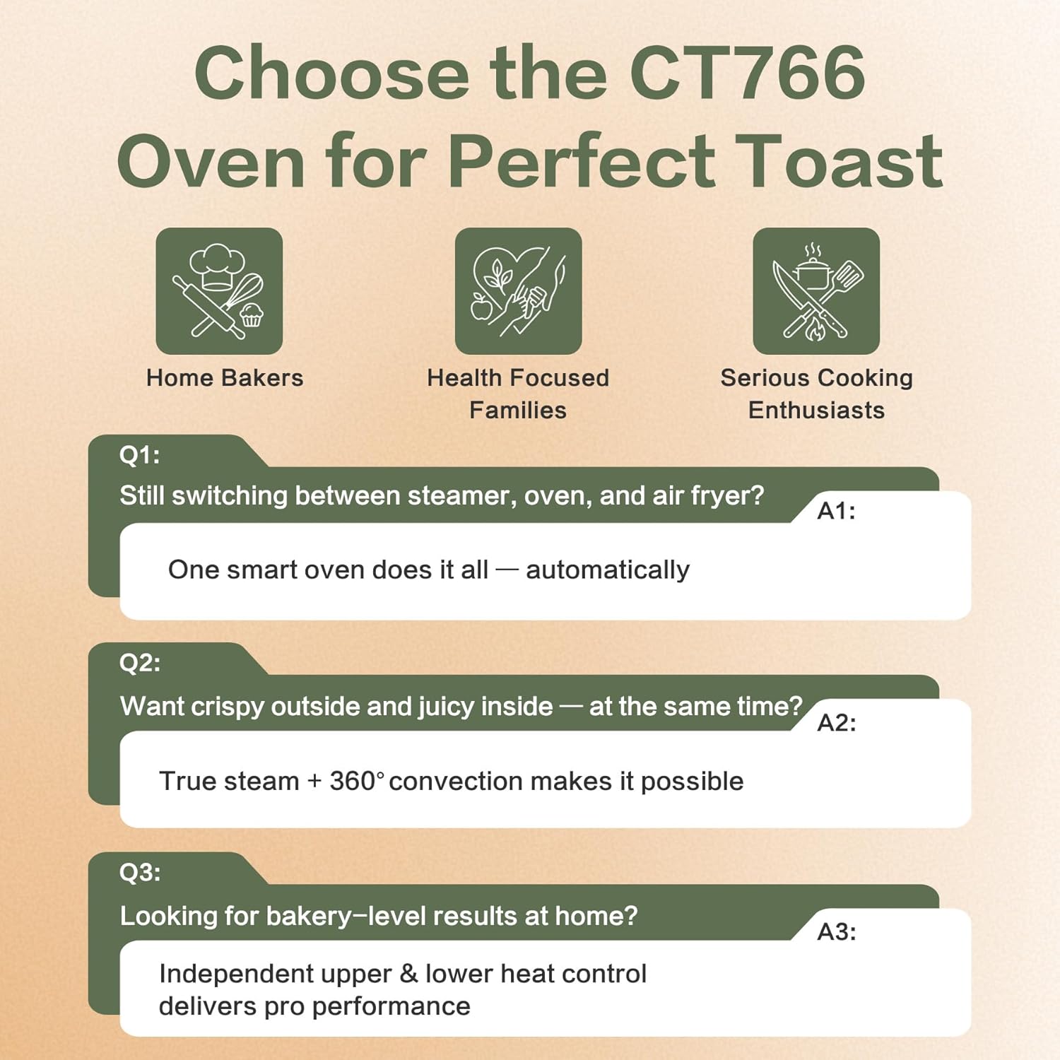 [3-Stage Multi-Function Cooking for Better Baking Results] Automatic multi-stage cooking programs combine steam, bake, and air fry to achieve better top browning, juicy interiors, and best crust texture for bread, cakes, and home baking needs