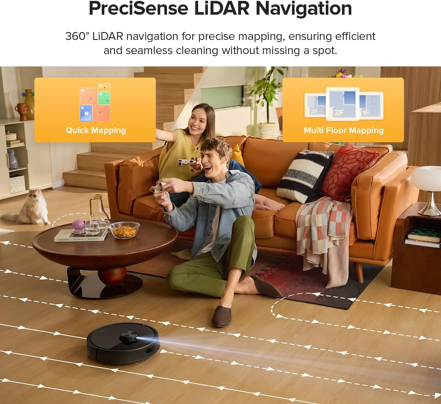 Smart Navigation with Precise LiDAR: Quickly scans and builds precise maps in seconds, finding the optimal cleaning route for your home. You can visualize your home and add furniture, pet supplies, and flooring materials to the app.