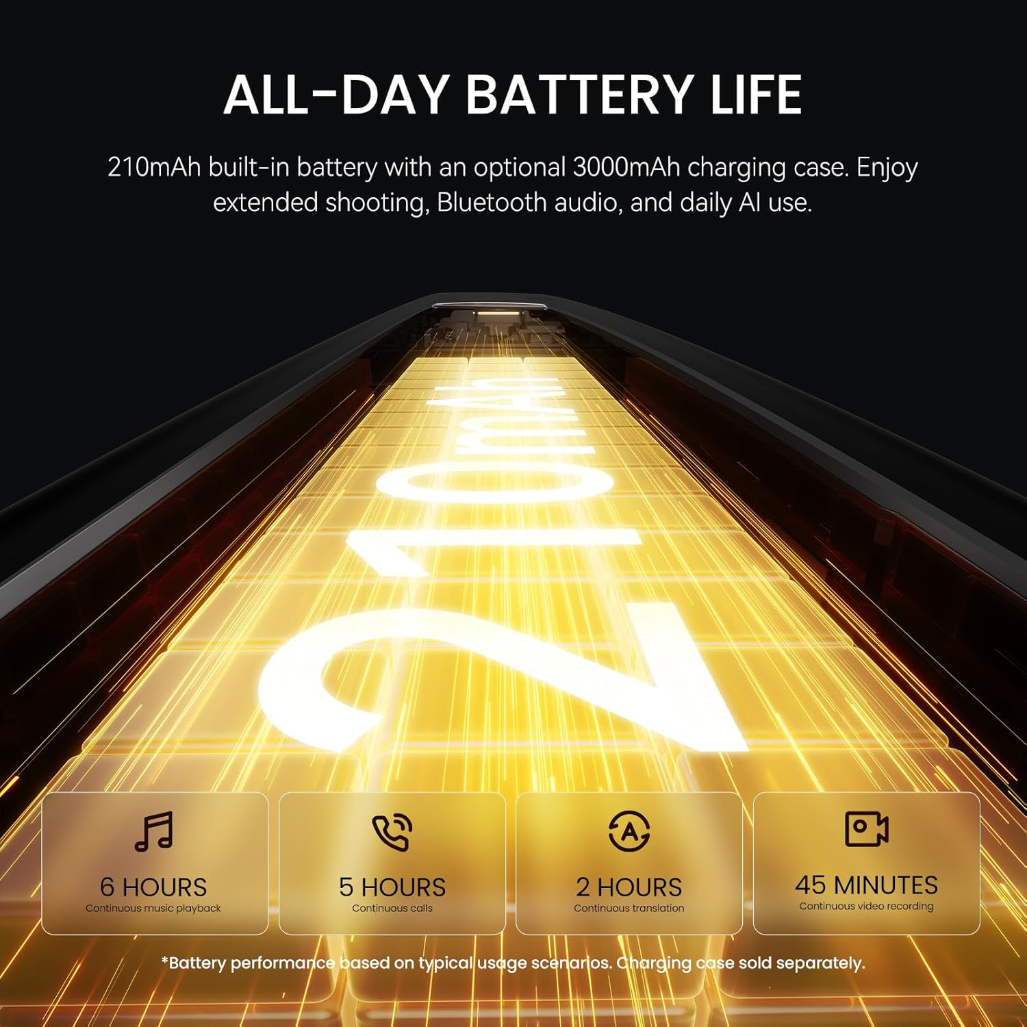 All-Day Battery System: The built-in 210mAh battery supports 6 hours of music 5 hours of calls 2 hours of online translation or 45 minutes of video recording. For extended use an optional 3000mAh charging case (sold separately) supports your AI assistant and recording needs throughout the longest journeys.
