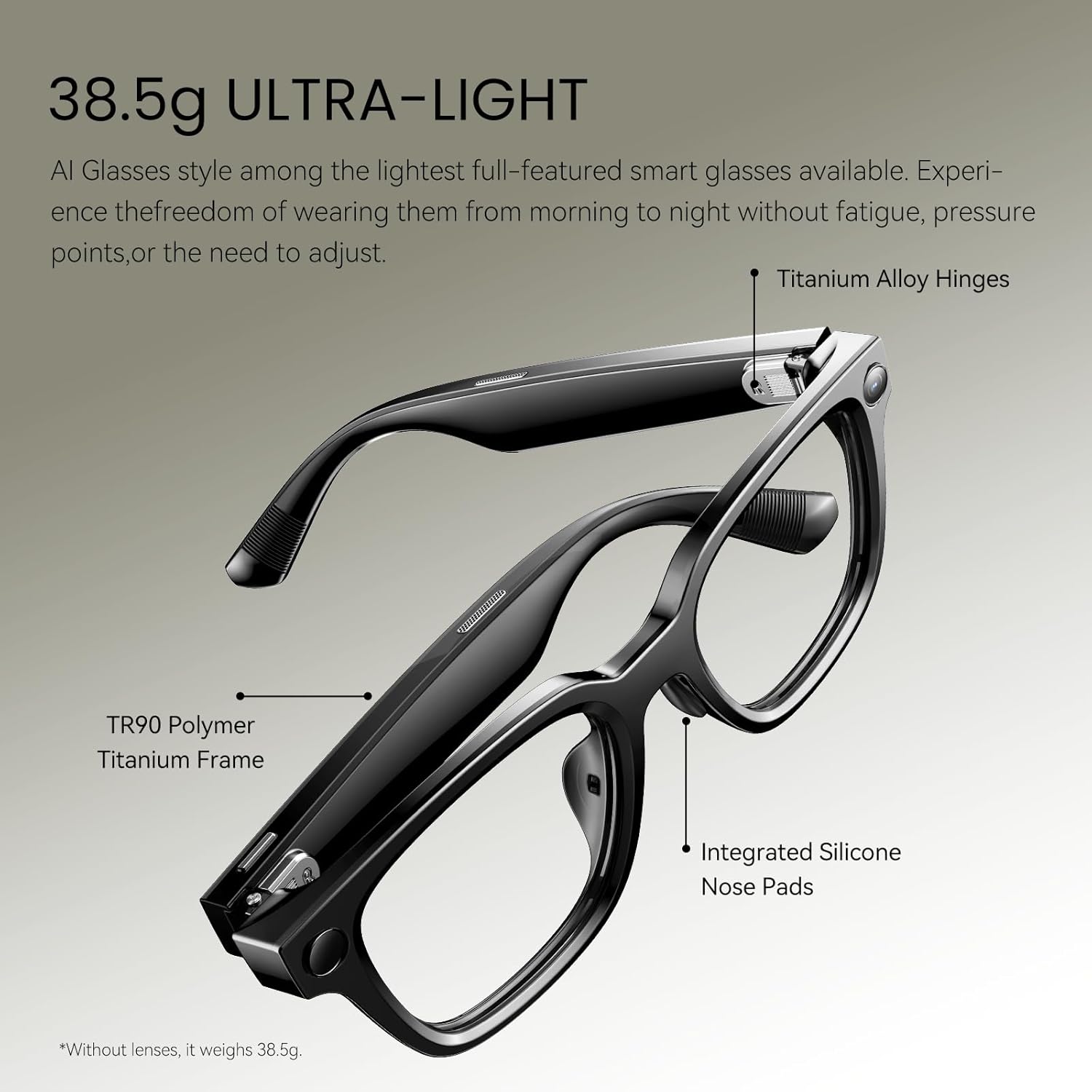 Ultra-Lightweight 38.5g Design: As one of the lightest smart glasses on the market the TR90 polymer titanium frame ensures extended wear with no pressure points and reduced fatigue. Designed for comfort from morning to night it feels so natural youll forget youre wearing tech.(*Without lenses it weighs 38.5 g)