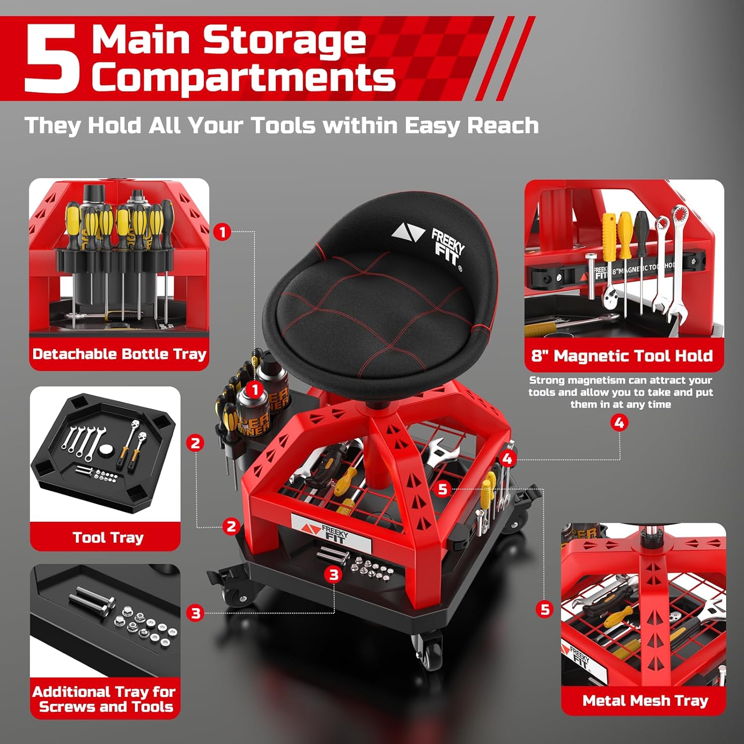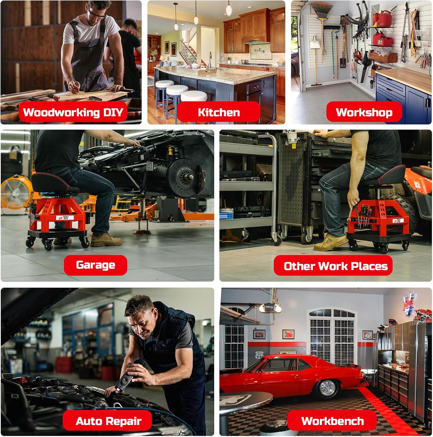 Engineering Design & High-Storage: Our Rolling Seat with square tube and steel ring structure provides space for resting the feet and the design of this automotive repair chair includes two tool trays located under the seat. The first layer is a metal mesh tray and the second layer is a solid plastic tray making it convenient to store and access necessary tools and parts. In addition we are also equipped with utility tool rack. It helps to keep the work area tidy and reduces the need for frequent tool movement